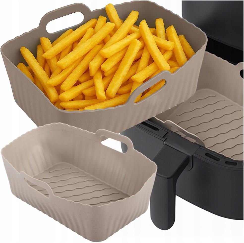 WKŁAD SILIKONOWY DO AIRFRYER FRYTKOWNICY BEZTŁUSZCZOWEJ FORMA DO PIECZENIA WKŁAD SILIKONOWY DO FRYTKOWNICY Silikonowy pojemnik do frytkownicy beztłuszczowej to niezastąpiony dodatek, który zmienia sposób, w jaki przygotowujesz codzienne posiłki. Dzięki niemu zyskujesz nie tylko większy komfort gotowania, ale również czystość i oszczędność czasu. Pojemnik jest kompatybilny z wieloma modelami frytkownic, w tym z urządzeniami marki Ninja, oferując wszechstronność użytkowania. Wysoka jakość wykonania sprawia, że korzystasz z niego wielokrotnie, bez obaw o trwałość czy funkcjonalność. Ergonomiczny kształt i przemyślane detale przekładają się na wygodę użytkowania każdego dnia. BEZTŁUSZCZOWE GOTOWANIE – IDEALNE DLA ZDROWIA Jeśli zależy Ci na wygodzie podczas codziennego gotowania, miękki silikon to dokładnie to, czego potrzebujesz. Dzięki swojej elastyczności pojemnik nie tylko ułatwia wyjmowanie potraw, ale również dopasowuje się do różnych modeli frytkownic, dając Ci większą swobodę. Możesz go bez trudu przechowywać, bo nie zajmuje dużo miejsca i nie odkształca się w czasie użytkowania. Silikon nie wydziela zapachów ani nie wchodzi w reakcję z żywnością, co podnosi komfort i bezpieczeństwo użytkowania. To rozwiązanie, które nie tylko ułatwia pracę, ale także podnosi jakość przygotowywanych posiłków. WYTRZYMAŁY MATERIAŁ – BEZPIECZNY W UŻYTKOWANIU Po przygotowaniu pysznego dania nie musisz martwić się sprzątaniem – można myć w zmywarce, co znacząco oszczędza Twój czas i wysiłek. Pojemnik nie wymaga szorowania ani specjalistycznych środków, co czyni go wyjątkowo praktycznym w codziennym użytkowaniu. Ryflowana powierzchnia dodatkowo zapobiega przywieraniu potraw, dzięki czemu utrzymanie czystości to czysta formalność. Nie musisz już używać papierowych wkładek ani folii aluminiowej – pojemnik wielokrotnego użytku to ekologiczna i ekonomiczna alternatywa. To doskonałe rozwiązanie dla osób ceniących wygodę, higienę i funkcjonalność w kuchni. SPECYFIKACJA TECHNICZNA Kod produktu: 07339 Bezpieczne dla żywności Szerokie zastosowanie Chroni urządzenie przed zabrudzeniami Uchwyty do przenoszenia WYMIARY Wysokość: 7cm Wymiary na dole pojemnika: 18cm x 12cm Wymiary na górze pojemnika: 20cm x 14cm DOSTĘPNE KOLORY Wyboru koloru prosimy dokonać wyłącznie w formularzu zakupowym (w trakcie składania zamówienia). W przypadku braku informacji - wyślemy kolor losowy. Szary Fioletowy Różówy Czerwony Niebieski ZESTAW ZAWIERA Fabrycznie nowy wkład silikonowy do frytkownicy Foliowe opakowanie