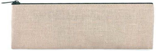 6 elementowy zestaw, zawierający piórnik z juty i bawełny, bambusową linijkę, drewnianą temperówkę, gumkę, ołówek i długopis z tektury z niebieskim tuszem.