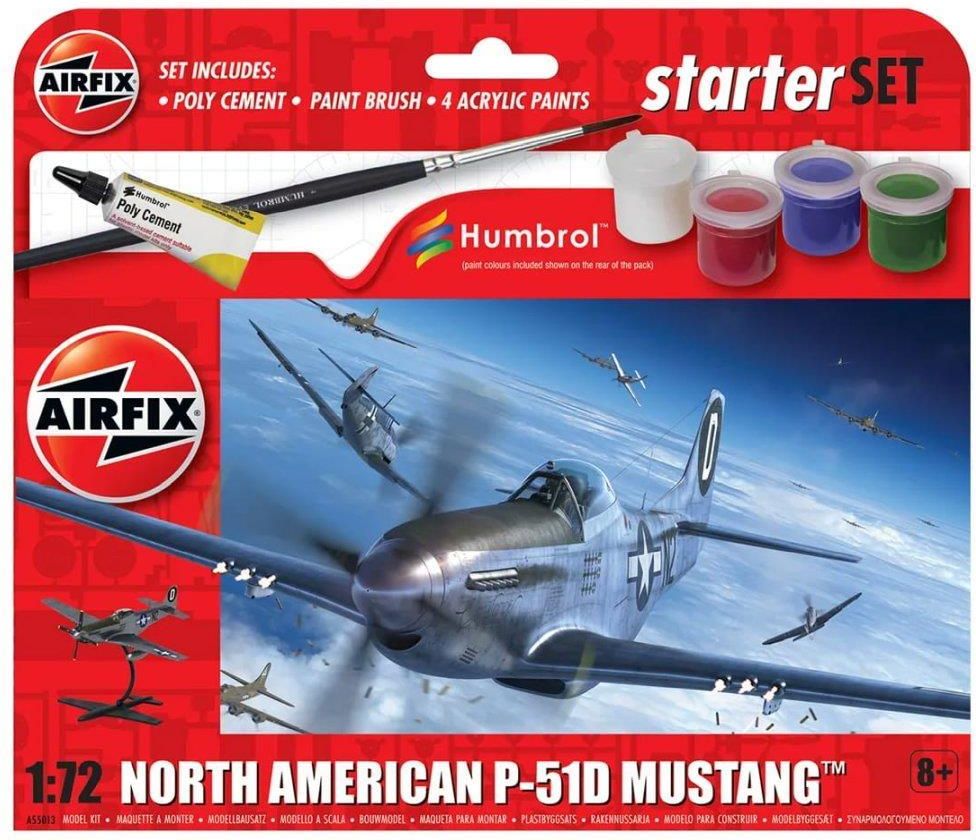 Airfix Starter Set - North American P-51D Mustang to model prawdopodobnie ostatecznego wariantu północnoamerykańskiego Mustanga, który zawierał kilka znaczących ulepszeń już i tak udanego projektu samolotu. Obejmowały one nowy kokpit zapewniający lepszą widoczność dla pilota, wprowadzenie skutecznego nowego celownika K-14, zwiększenie siły ognia, ulepszenie systemu podawania amunicji w celu zmniejszenia zacinania się oraz wprowadzenie lekkich zewnętrznych zbiorników paliwa, aby jeszcze bardziej zwiększyć zasięg myśliwca. Mustang znacząco przyczynił się do ostatecznego zwycięstwa aliantów w Europie, niszcząc więcej samolotów wroga w walce powietrze-powietrze niż jakikolwiek inny myśliwiec United States Army Air Forces w europejskim teatrze działań wojennych.