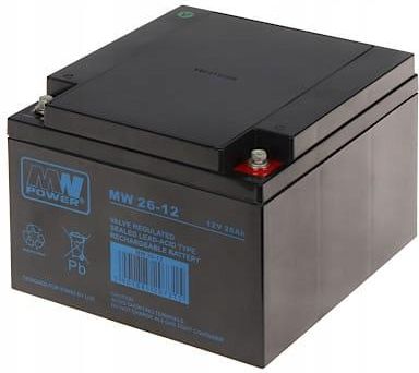 Akumulator MW 26-12 AGM 12V/26AH-MW Kod towaru: MW 26-12 Akumulatory MW Power serii MW są przeznaczone do stosowania zarówno w systemach zasilania awaryjnego jak i innych aplikacjach w których akumulator pracuje cyklicznie. Preferowane zastosowania akumulatorów tej serii to: zasilanie rezerwowe w systemach automatyki, kasach fiskalnych, źródło energii w urządzeniach przenośnych, zasilanie silników i innych urządzeń w trybie pracy cyklicznej. Dla rozładowań 50% do 500 cykli. Projektowana żywotność wynosi 6-9 lat dla 20-25 °C. Dane techniczne: Napięcie nominalne 12 V Pojemność nominalna 26,0 Ah Wymiary Długość 166 mm Szerokość 175 mm Wysokość 125 mm Wysokość całkowita 125 mm Waga 8,4 kg Pojemność dla 25°C i napięcia odcięcia 10,5V 20h 26,0 Ah 10h 24,7 Ah 5h 22,1 Ah Rezystancja wewn. akum. naład. 9 mΩ Pojemność dla 20° 100% dla 0°C 85% dla -15°C 65% Samorozładowanie 3 m-ce 91% 6 m-cy 82% 12 m-cy 64% Terminal Śruba M5 Ładowanie Buforowe 13,50-13,80V Cykliczne 14,40-15,00V Max. prąd ładowania 7,8 A Max. prąd rozładowania 280 A (5 sek.) Temperatury pracy: Rozładowanie: -20°C ÷ 50°C , Ładowanie: -20°C ÷ 50°C , Przechowywanie: -20°C ÷ 50°C