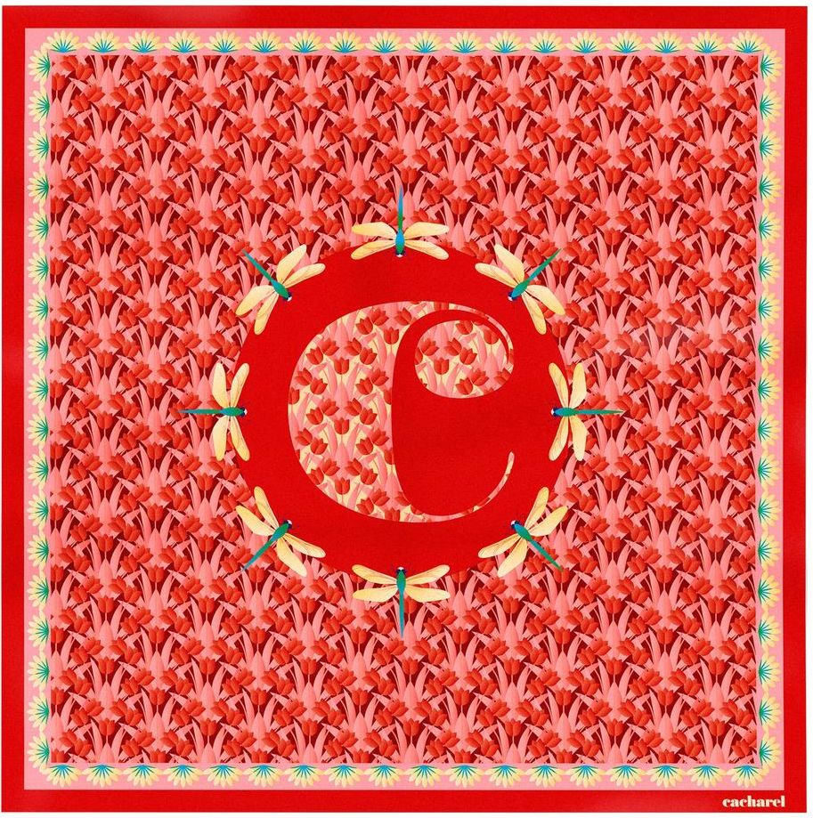 Apaszka Albane wykonana z wysokiej jakości poliestru w delikatny, jednak chrakterystyczny, kwiatowy wzór z pięknie wyeksponowanym logo Cacharel w centralnej części.