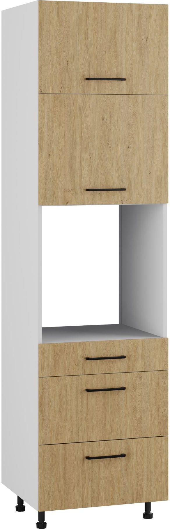 BARI SŁUPEK POD ZABUDOWĘ PIEKARNIKA DPS3-60-220 HK-XS MODERN DĄB KAMIENNY to słupek do kuchni wyposażony w okucia Blum oraz prowadnice Modernbox z systemem cichego domknięcia. Produkt wyróżnia się pojemną przestrzenią do przechowywania. Model posiada podwójne szafki z drzwiami uchylnymi, trzy szuflady oraz wnękę przeznaczoną pod zabudowę piekarnika. Kolekcja kuchni Komfort wykonana z płyty laminowanej jest łatwa w pielęgnacji oraz odporna na uszkodzenia mechaniczne. Seria Bari to doskonała alternatywa dla aranżacji rustykalnych, skandynawskich, retro, nowoczesnych, a także eklektycznych.