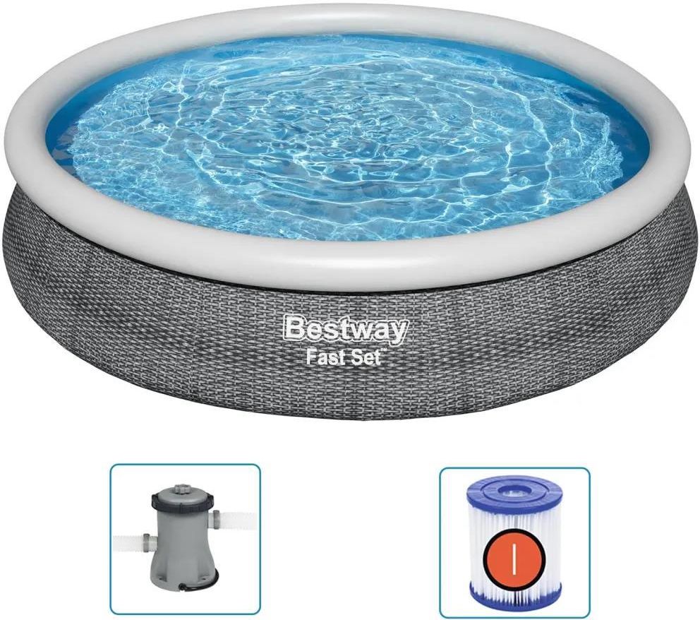 Nadmuchiwany basen marki Bestway zapewni mnóstwo zabawy Tobie i Twojej rodzinie lub przyjaciołom w ogrodzie lub na podwórku. Najwyższej jakości materiał: odporne na przebicie i promieniowanie UV ściany boczne z DuraPlus™ są wytrzymałe na obciążenia, naprężenia i ruch. Łatwe ustawianie: basen ogrodowy jest gotowy do napełnienia w 10 minut. Wybierz płaską powierzchnię, napompuj górną obręcz i zacznij wlewać wodę do basenu. Basen podniesie się, gdy zostanie napełniony wodą. Łatwe spuszczanie wody: wbudowany zawór spustowy z regulacją przepływu podłącza się do węża ogrodowego w celu spuszczania wody. Basen: Kolor: szaro-biały Materiał: PVC Wymiary: 366 x 76 cm (śr. x wys.) Pojemność (80%): 5377 l (1421 gal.) Realistyczny nadruk rattanu na ścianach zewnętrznych Gotowy do napełniania wodą w 10 minut Łatwy demontaż i przechowywanie poza sezonem Pompa filtracyjna: Zasilanie: 220-240 V~ Wielkość przepływu wody: 1060 l/h (280 gal./h) Z łącznikami zapewniającymi kompatybilność z pompami filtrującymi Flowclear™ Zawartość paczki: 1 x basen 1 x pompa filtracyjna