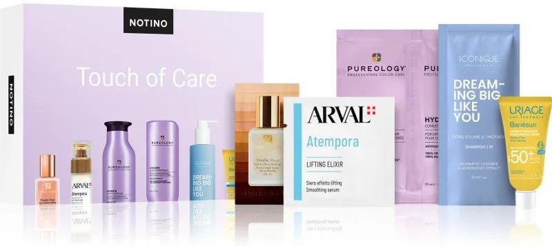 Beauty Discovery Box Notino Touch of Care, 1 szt., Zestawy kosmetyków dla kobiet, Nie przegap okazji, by poznać najpopularniejsze kosmetyki światowych marek. Zestaw Beauty Discovery Box Notino Touch of Care zawiera mini wersje produktów lub próbki, które można przetestować na sobie w domowym zaciszu. Bądź na bieżąco z tym, co obecnie zachwyca świat urody. Zawartość zestawu: Pureology Hydrate szampon nawilżający 20 ml Arval Atempora Lifting Elixir serum wygładzające 1 szt. Uriage Bariésun Moisturizing Cream SPF 50+ krem ochronny do twarzy i ciała SPF 50+ 3 ml Estée Lauder Double Wear Stay-in-Place trwały podkład SPF 10 1 ml ICONIQUE Professional DREAMING BIG LIKE YOU Volume & Thickness szampon do zwiększenia objętości 10 ml Właściwości: produkty umożliwiają stworzenie kompleksowej pielęgnacji na co dzień limitowana edycja