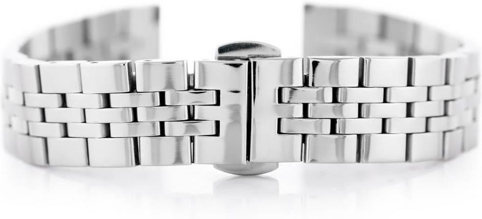 WYMIARY: szerokość przy mocowaniu: 16mm szerokość bransolety: 16/14mm długość całkowita po rozłożeniu: 174mm maksymalny obwód: ok. 16 cm (do obwodu należy doliczyć rozmiary koperty docelowego zegarka) OPIS:Stalowa bransoletka z zapięciem motylkowym do zegarka wysokiej jakości w kolorze srebrnym. Możliwość skrócenia bransolety poprzez usunięcie ogniw - można usunąć maksymalnie 6, szerokość jednego ogniwa to ok. 7mm.