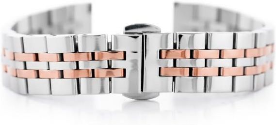 WYMIARY: szerokość przy mocowaniu: 14mm szerokość bransolety: 14/12mm długość całkowita po rozłożeniu: 174mm maksymalny obwód: ok. 16 cm (do obwodu należy doliczyć rozmiary koperty docelowego zegarka) OPIS: Stalowa bransoletka z zapięciem motylkowym do zegarka wysokiej jakości w kolorze srebrno-różowozłotym. Możliwość skrócenia bransolety poprzez usunięcie ogniw - można usunąć maksymalnie 6, szerokość jednego ogniwa to ok. 7mm.