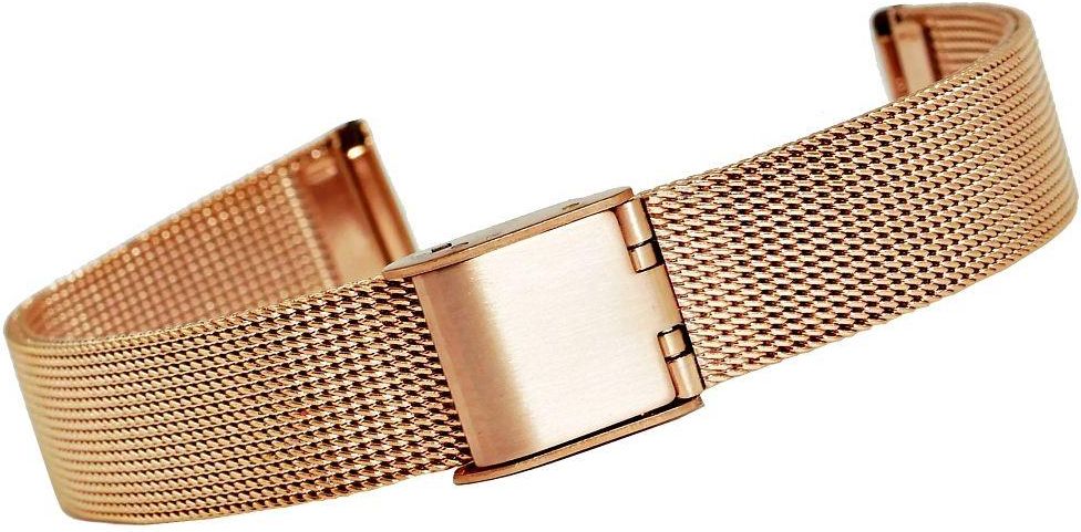 Bransoleta Siatka Różowe Złoto 14 mm 301RG14 Opis: Kolor: różowe złoto Materiał: stal szlachetna Regulacja długości: tak Zabezpieczenie przed ewentualnym odpięciem: nie Wymiary (mm): Szerokość: 14 Szerokość przy mocowaniu - teleskopie: 14 Długość części z regulacją: 110 Długość części z zapięciem: 85 Długość maksymalna (należy dodać rozmiar koperty): 180 Grubość bransolety: 1,6