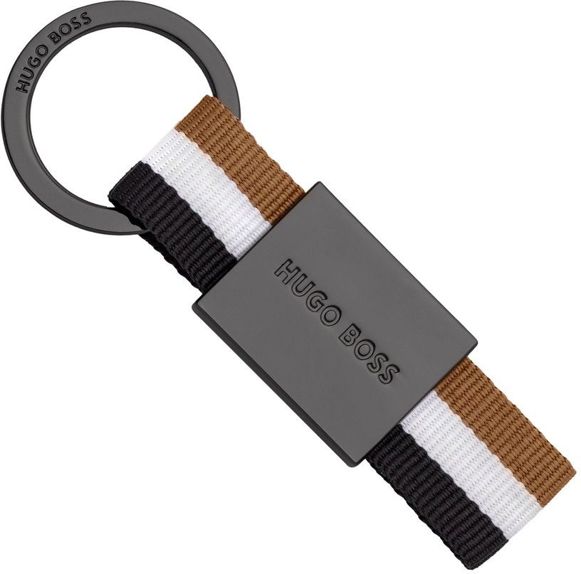 Ten brelok został zaprojektowany, aby uczcić nową markę HUGO BOSS oraz ich graficzne i nowoczesne ikoniczne 3 kolorowe paski. Podpisany trójkolorowy pasek jest wzmocniony luksusowymi chromowanymi akcentami metalowymi, przekształcając codzienne podstawowe rzeczy w nowoczesne i niedopowiedziane akcesoria.