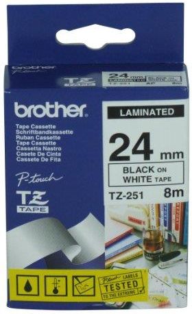Brother P-Touch Tape Black on White, TZ251 Brother P-Touch Tape Black on White 24 mm 24 mm, czarny na białym, laminowany Taśmy TZe są kompatybilne ze wszystkimi istniejącymi maszynami do taśmy TZ. Taśma TZe oferuje lepsze świadectwo ekologiczne i zastąpi naszą oryginalną gamę taśm TZ. …