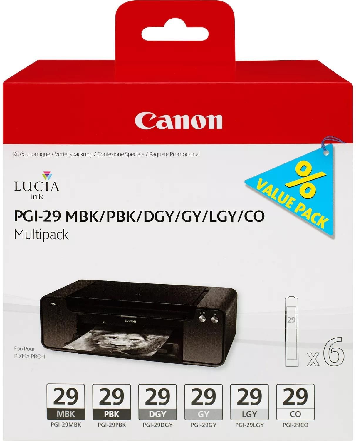 Wielopak obejmujący 6 kaset z atramentem Canon PGI-29 MBK/PBK/DGY/GY/LGY/CO Ten wielopak zawiera po jednym zbiorniku z atramentem koloru czarnego matowego, fotograficznego czarnego, ciemnoszarego, szarego i jasnoszarego. Zestaw pięciu zbiorników z kolorowym atramentem o pojemności 36 ml to wygoda i …