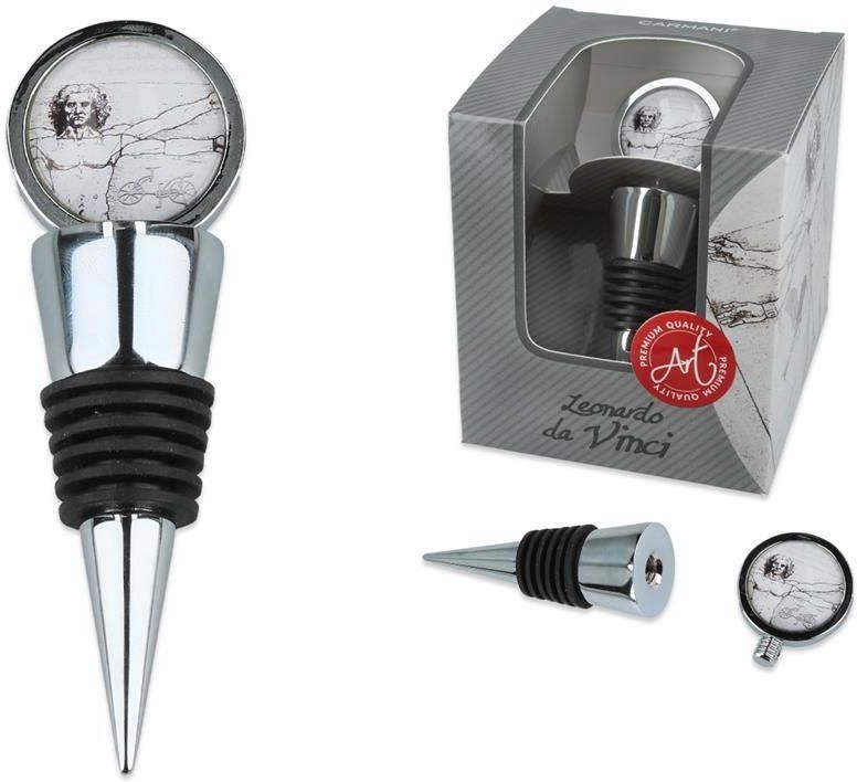 Elegancki metalowy korek - zatyczka do butelki z silikonową uszczelką, dzięki której trunek po otwarciu zachowa dłużej swój smak i aromat. Korek ozdobiony okrągłym kaboszonem z dziełem sztuki. Motyw: Leonardo da Vinci "Człowiek witruwiański" Długość: 10 cm