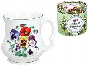 Bardzo ładny, wykonany z połyskującej porcelany kostnej poręczny kubek o kwiatowym motywie(kolorowe bratki) z kolekcji Carmani - porcelana Babuni wzorowanej na już niedostępnych produktach angielskiej manufaktury "David Michael".Kubki z tzw. "kolekcji Babuni" często nazywane są wiktoriańskimi od imienia Victoria, jednej z najdłużej żyjących oraz najdłużej panujących monarchiń Wielkiej Brytanii i Irlandii - królowej Victorii, która to wprowadziła na królewski, angielski stół w dużych ilościach doskonałej jakości użytkową porcelanę, często o oryginalnych kształtach i dekoracjach.Kształt kubków Babuni inspirowany jest XIX-wiecznymi kubkami, właśnie z okresu panowania królowej Victorii. Jak już w/w produkt firmowany przez Carmani - popularną, bardzo cenioną markę m.in.: ze względu na bardzo dobrą jakość i wzornictwo.Carmani to wywodząca się z Antypodów marka obecna na polskim rynku już od końca lat 90-tych ubiegłego wieku, której kolekcje są niezwykle cenione w kraju i na Świecie(do najpopularniejszych kolekcji Carmani należą: "Gustav Klimt", "Vincent van Gogh", "The Greatest Masters of Painting", "Poppies & Pansy" i "Crazy Cats").Pod marką Carmani odnajdziecie zawsze produkty wysokiej jakości jak np. filiżanki i kubki porcelanowe, zestawy/komplety z porcelany, figurki, szkło i sztućce itp., z popularnymi, cenionymi i lubianymi motywami jak m.in.: kolekcje malarstwa znakomitych, nieżyjących już malarzy(np.: Gustav Klimt, Claude Monet, Vincent van Gogh, itp.) oraz współczesnych(np.: Konstantin Razumov, Wassily Kandinsky, Vladimir Volegov, itp.). Idealny na miły upominek, ale również do codziennego picia swojego ulubionego napoju niezależnie od tego czy będzie to zielona herbata, aromatyczna kawa czy gorące kakao - na pewno będzie smakował zupełnie inaczej :-) Podstawowa specyfikacja: wysokość kubka = około 9,5cm średnica kubka = do około 8,5cm pojemność kubka = około 370ml porcelana: kostna, bardzo dobrej jakości opakowanie: kartonowe, upominkowe motyw: obustronnie inny, trwale naniesiony kubek dopuszczony do kontaktu z żywnością/gorącymi napojami oryginalny produkt Carmani użytkowanie: można myć w zmywarce do naczyń kolekcja: Carmani - porcelana Babuni