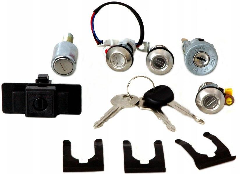Komplet zamków i wkładów z kluczykami. W skład kompletu wchodzą wkładki do: drzwi prawe, lewe tylna klapa, schowek, stacyjka - długość bolca wkładu stacyjki 8 mm. blokada koła zapasowego. Wszystko otwierane jednym kluczykiem. UWAGA - w podanych rocznikach występowały 2 rodzaje wkładek stacyjki, …