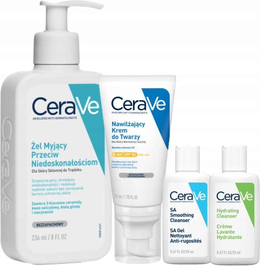 W skład zestawu wchodzą CeraVe Nawilżający Krem do Twarzy SPF 50, 52ml - Dla Skóry Normalnej i Suchej CeraVe Żel Myjący Przeciw Niedoskonałościom 236ml - Do Skóry Tłustej i Skłonnej do Trądziku CeraVe Pianka Myjąca Przywracająca Równowagę 50ml - W PREZENCIE CeraVe Oczyszczający żel do mycia 20ml - W PREZENCIE CeraVe Nawilżająca emulsja do mycia 20ml - W PREZENCIE CeraVe Wygładzający Żel 20ml - W PREZENCIE CeraVe Nawilżający Krem do Twarzy SPF 50, 52ml - Dla Skóry Normalnej i Suchej Nawilżający krem o wysokiej ochronie przeciwsłonecznej UVA i UVB Idealny dla skóry normalnej oraz suchej. Zawiera kwas hialuronowy, który intensywnie nawilża oraz poprawia jędrność skóry. Dzięki zawartości 3 kluczowych dla skóry ceramidów wspiera odbudowę naturalnej bariery ochronnej skóry. Zawiera niacynamid, który koi i wygładza skórę. Dzięki Technologii MVE stopniowo uwalnia składniki aktywne przez całą dobę. Marka stworzona z dermatologami Odpowiedni dla skóry normalnej i suchej. Niekomedogenny, bez substancji zapachowych. Zapewnia nawilżenie do 24h. Zapewnia ochroną przeciwsłoneczną UVA i UVB. CeraVe Żel Myjący Przeciw Niedoskonałościom 236ml - Dla Skóry Tłustej i Skłonnej do Trądziku Także dla skóry wrażliwej. Oczyszcza pory, zmniejsza niedoskonałości oraz redukuje nadmiar sebum, nie naruszając jednocześnie bariery ochronnej skóry. Zawiera 3 kluczowe ceramidy, kwas salicylowy, białą glinkę, niacynamid. Marka stworzona z dermatologami Bezzapachowy. Niekomedogenny. Nie wysusza skóry - bez alkoholu etylowego. Składniki aktywne Ceramidy Trzy kluczowe dla skóry ceramidy regenerują jej naturalną barierę ochronną. Kwas hialuronowy Intensywnie nawilża oraz poprawia jędrność skóry, dzięki zdolności wiązania wody w naskórku. Technologia MVE Opatentowana technologia stopniowego uwalniania składników aktywnych przez całą dobę. Witamina B3 (niacynamid) Koi skórę oraz reguluje wydzielanie sebum. Witamina E Pomaga chronić skórę przed negatywnym działaniem wolnych rodników. Ceramidy Odbudowa Bariery Ochronnej Skóry CeraVe to kompozycja trzech ceramidów o budowie identycznej z ceramidami zawartymi w skórze: ceramid 1, ceramid 3, ceramid 6-II, a także cholesterolu, kwasów tłuszczowych i fitosfingozyny. Składniki te pomagają odbudować naturalną barierę ochronną naszej skóry, dzięki czemu wspierają utrzymanie optymalnego poziomu nawilżenia oraz odporność na działanie czynników zewnętrznych.