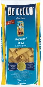 Historia marki De Cecco sięga 1886 roku, kiedy to dwaj bracia Nicola oraz Filippo założyli w małym miasteczku Fara San Martino rodzinną firmę wytwarzającą makrony. Produkcja pasty odbywała się jednak według nowatorskiej metody opracowanej przez braci - mianowicie makarony były suszone w zamkniętym pomieszczeniu w niskiej temperaturze przez ponad 24 godziny, zamiast szybkiego suszenia na zewnątrz na słońcu. Umożliwiło to produkcję doskonałej pasty niezależnie od warunków atmosferycznych, a ponadto gwarantowało zawsze tą samą, najwyższą jakość wyrobów.Aktualnie pasty marki De Cecco są jednymi z najczęściej wybieranych przez włoskich konsumentów, a także stają się coraz bardziej popularne wśród amatorów włoskiej kuchni na całym świecie. Dzieje się tak dzięki przywiązaniu do tradycyjnej i sprawdzonej technologii produkcji oraz zastosowaniu najwyższej jakości surowców. Warto podkreślić, iż wyjątkowej świeżości semolina - mąka z pszenicy durum - używana do wytwarzania pasty chodzi wyłącznie z młynów należących do koncernu De Cecco, co pozwala dokładnie kontrolować jakość już od samego początku procesu produkcji. Niezwykle istotny jest fakt, iż podczas mielenia ziaren pszenicy durum wykorzystuje się okrywę nasienną zboża, dzięki czemu semolina zawiera zdecydowanie więcej witamin, składników mineralnych oraz błonnika w porównaniu ze zwykłą mąką pszenną. Co bardzo ciekawe wszystkie formy makaronu De Cecco powstają w unikalnym procesie bez użycia forem z brązu, co pozwala zachować walory kolorystyczne i smakowe pasty po ugotowaniu. Rigatoni jest jednym z najpopularniejszych oraz najbardziej lubianych kształtów makaronu we Włoszech. Pochodzi z Rzymu i jest ściśle związany z włoską tradycją kulinarną. Pasta Rigatoni to stosunkowo szerokie, prążkowane rurki makaronu w które bez trudu można uchwycić kawałek mięsa lub warzyw. Karbowany kształt zapewnia właściwe utrzymywanie się sosu na jego powierzchni. Dlatego też pasta Rigatoni jest szczególnie polecana do przygotowywania wybornych sosów mięsnych oraz warzywnych. z powodzeniem może być wykorzystane również w potrawach wymagających pieczenia w piekarniku w naczyniach żaroodpornych. zalecany czas gotowania makaronu De Cecco Rigatoni nr 24 wynosi od 11 minut (al dente) do 13 minut (cottura). Oferowana przez nas pasta De Cecco jest oryginalnym włoskim produktem, pochodzącym z włoskiej dystrybucji.