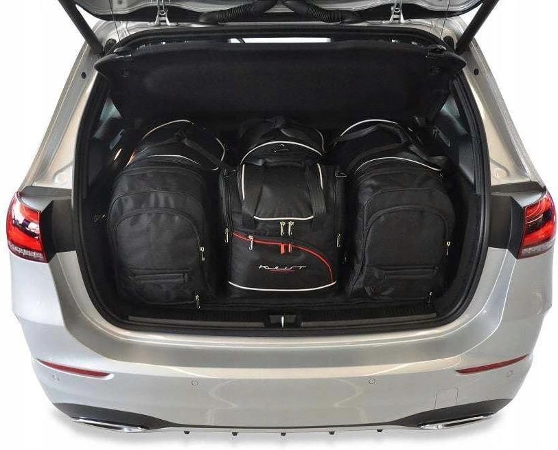 TORBY MERCEDES-BENZ B 2016+ 4 SZT Kolory: Czarny Materiał: Poliester Materiał uchwytu: pas samochodowy Pociągacze zamka: metalowe, niklowane Podszewka wewnętrzna: czarna z poliestru Zamek: spiralny, czarny Zestaw dedykowanych toreb podróżnych. Wykonane w wysokiej jakości poliestru 1680D ze specjalną powłoką poliuretanową. Odporne na działanie warunków atmosferycznych - wilgoci, niskich i wysokich temperatur ( od -50 do +80 C ). Odporne na przetarcia. Łatwe w utrzymaniu czystości, wystarczy wilgotna szmatka. Niezwykle lekkie. Wygodne przechowywanie, dzięki unikalnej konstrukcji pozwalającej na złożenie toreb niemal na płasko. Oferowane torby mogą również służyć jako osobny element, mogą z powodzeniem zastąpić walizki lotnicze czy torby sportowe. Bezpieczeństwo, torby ułożone w zestaw nie przemieszczają się po bagażniku, co jest istotne podczas gwałtownych manewrów. Dzięki perfekcyjnemu dopasowaniu, załadujesz do 30% więcej rzeczy niż wcześniej. Asymetria toreb pozwala na idealne przyleganie do oparcia tylnej kanapy, co wydatnie zwiększa powierzchnię pakowania oraz bezpieczeństwo. Torby podręczne są zaprojektowane na bazie sportowych toreb piłkarskich. Ich cecha charakterystyczna to dodatkowa komora odgrodzona od głównej części torby. Umożliwia szybki dostęp do np. kosmetyczki, butów itp. lub odgrodzeniu np. ręczników, strojów sportowych itp.