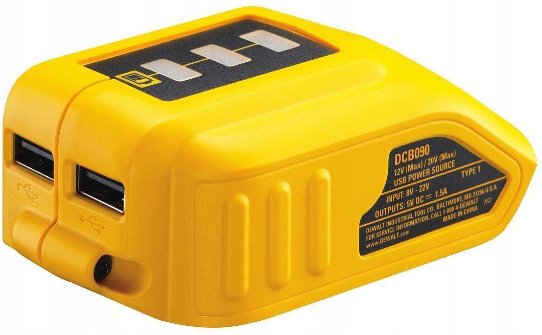 adapter akumulatorów DeWalta'a [DCB090] - zamienia akumulator z serii XR w przenośną ładowarkę dla telefonów, smartfonów, mp3, tabletów, nawigacji i wszystkich urzadzeń które mają możliwość ładowania kablem USB; posiada dwa gniazda USB można równocześnie ładować aż dwa urzadzenia jednocześnie adapter akumulatorów DeWalta'a [DCB090] - zamienia akumulator z serii XR w przenośną ładowarkę dla telefonów, smartfonów, mp3, tabletów, nawigacji i wszystkich urzadzeń które mają możliwość ładowania kablem USB; posiada dwa gniazda USB można równocześnie ładować aż dwa urzadzenia jednocześnie; adapter DCB090 wspólracuje z akumulatorami serii XR o napięciu 10,8V ; 14,4V ; 18V i ma bardzo czytleny wskaźnik stanu naładowania akumulatora