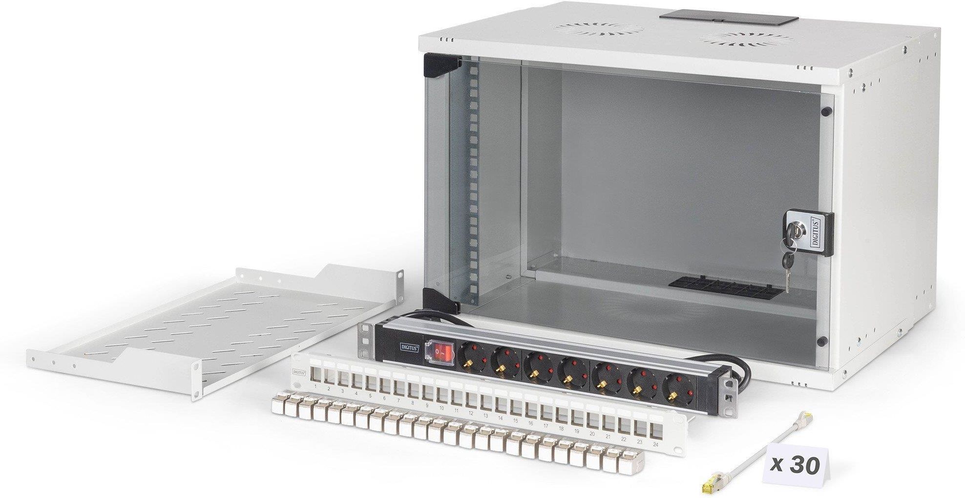 Kompletny zestaw do konfiguracji kompaktowej sieci 483 mm (19"), w tym szafka, półka, listwa gniazd, panel krosowy, moduły keystone, kable krosowe. - W tym obudowa naścienna SOHO PRO, 7U, 370 x 540 x 400 mm, niezmontowana (DN-49202) - W tym półka, 1U (DN-97609) - Zawiera listwę gniazdową, 1U, 7 x styk uziemiający, z przełącznikiem (DN-95402) - W tym modułowy panel krosowy, 24-portowy (DN-91410) - Zawiera 24 x moduł Keystone, CAT 6A, ekranowany (DN-93615-24) - W zestawie 30 x kabel krosowy, CAT 6A, S/FTP, 0,25 m Niezależnie od tego, czy chodzi o dom, biuro, czy podrozdzielnice o ograniczonej przestrzeni: Dzięki kompaktowym rozwiązaniom 483 mm (19") z serii SOHO Pro można zainstalować sieć w dowolnym miejscu. Instalacja zajmuje tylko kilka kroków i jest dziecinnie prosta dzięki dołączonej instrukcji krok po kroku. Dostępne w czterech wersjach wysokości (4U, 7U, 9U, 12U), te zestawy sieciowe zawierają idealnie dopasowane komponenty DIGITUS, aby zapewnić szybkie i łatwe okablowanie IT gotowe do użycia. Obudowa sieciowa i odpowiednie akcesoria (np. przełącznik, panel krosowy, listwa gniazdowa, półka, panel zarządzania kablami, kabel krosowy itp.) są dostarczane w kompaktowym pudełku kartonowym.