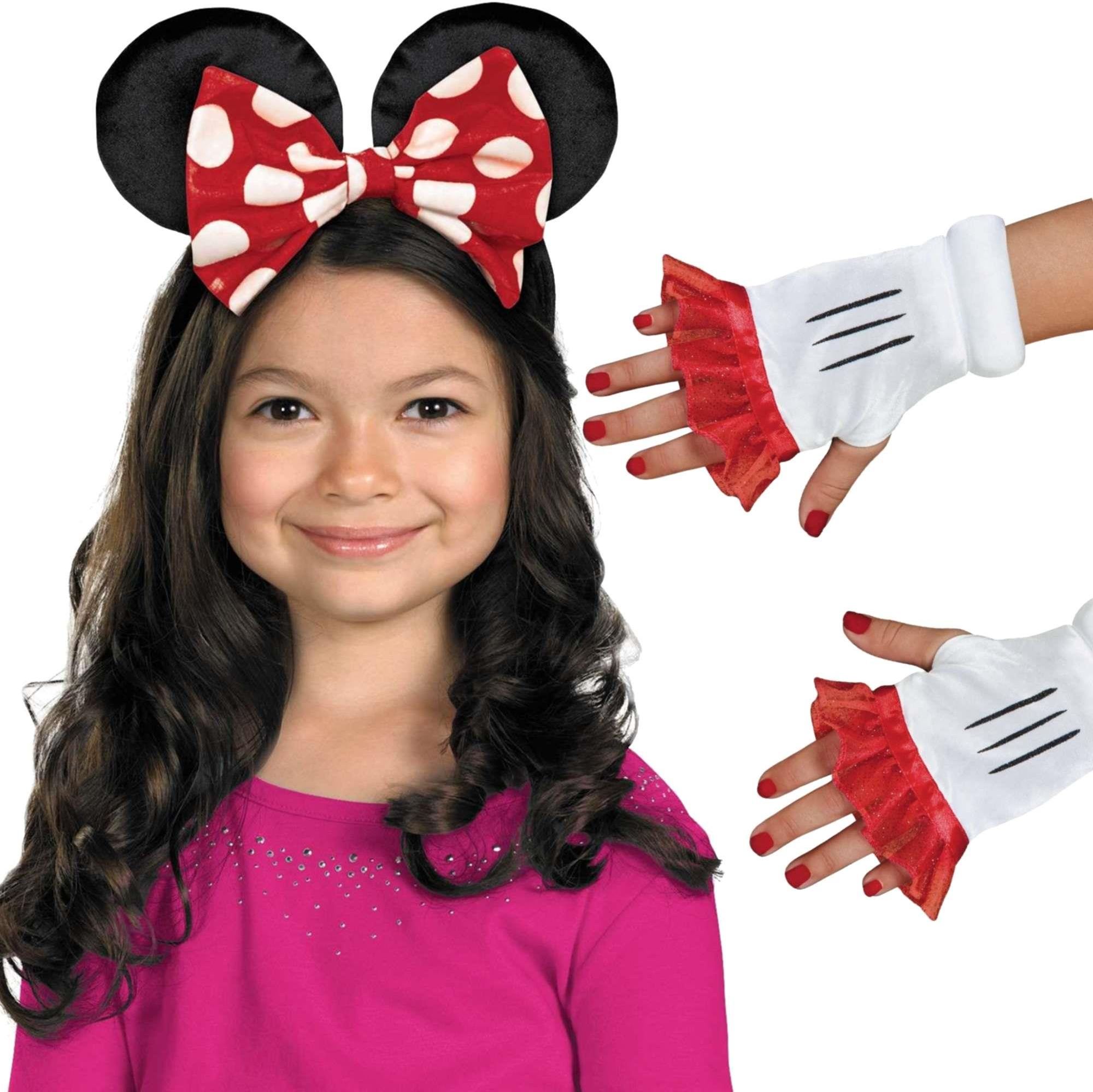 Słodka opaska do włosów z uszkami Myszki Minnie i ozdobną czerwoną kokardką w białe kropeczki oraz rękawiczki bez palców z motywem Myszki Minnie z błyszczącymi czerwonymi koronkowymi falbankami to fantastyczne akcesoria dla dziewczynki na każdą imprezę.