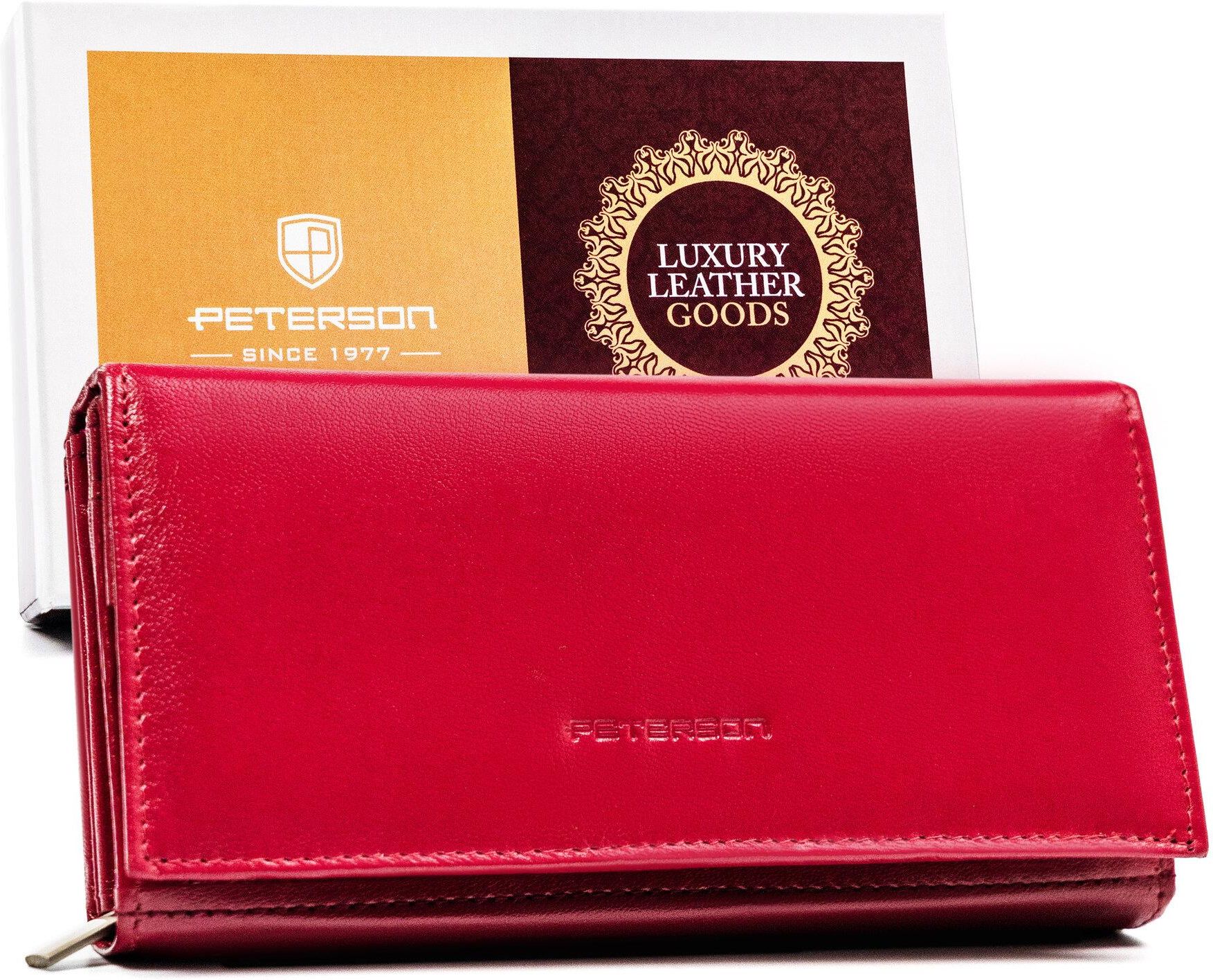 Duży, skórzany portfel damski na zatrzask — Peterson Produkt najwyższej jakości | Odszyty bardzo trwale z doskonałej jakości skóry naturalnej o gładkiej fakturze; Klasyczny dodatek | Portfel o klasycznej stylistyce. Model w orientacji poziomej, zapinany bezpiecznym i trwałym zatrzaskiem; Duża ilość przegródek na karty | Portfel będzie dla Ciebie idealny, jeżeli na co dzień nosisz dokumenty w dużym formacie jak np. dowód rejestracyjny. Ponadto zmieścisz w nim pokaźne ilości kart oraz gotówki; Ochrona Twoich kart | Wyposażony w technologię RFID BLOCKING SYSTEM, która zabezpiecza karty zbliżeniowe, dokumenty biometryczne, legitymacje i karty komunikacji miejskiej przed nieautoryzowanym odczytem danych. Uporządkuj swoje karty i dokumenty W portfelu mieści się: aż 12 przegródek dedykowanych na karty, wizytówki lub dokumenty w standardowym formacie; trzy z nich są przezroczyste; 2 kieszonki na dokumenty w większym formacie, jak dowód rejestracyjny w okładce; 1 schowek w centralnej części zapinany na suwak. Przegródki na karty i dokumenty też zabezpieczono podszewką. Pozwala to uniknąć otarć na skórze, podczas wkładania i wyjmowania kart. Sekcja na gotówkę z wygodnym dostępem Portfel jest bardzo pojemny. Kieszenie na banknoty i monety są odpowiednio duże, aby pomieścić pokaźne ilości pieniędzy. bilon możesz schować do 2 wewnętrznych kieszeni. Jedna z kieszeni zapinana jest na suwak, druga klapką na zatrzask; banknoty zmieścisz w 2 pojemne, otwarte przegródki.