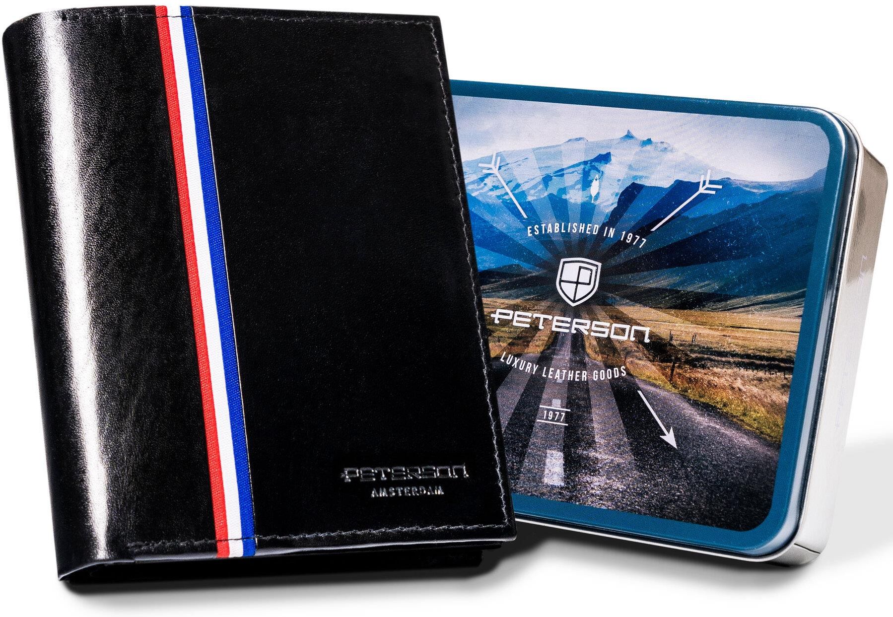 Duży portfel męski bez zapięcia zewnętrznego — Peterson Ergonomiczny design | Odszyty bardzo trwale z doskonałej jakości gładkiej skóry naturalnej w czarnym kolorze, dodatkowo na froncie portfela wyszyto trójkolorowy paseczek; Duży portfel o klasycznej stylistyce. Model w orientacji pionowej bez …