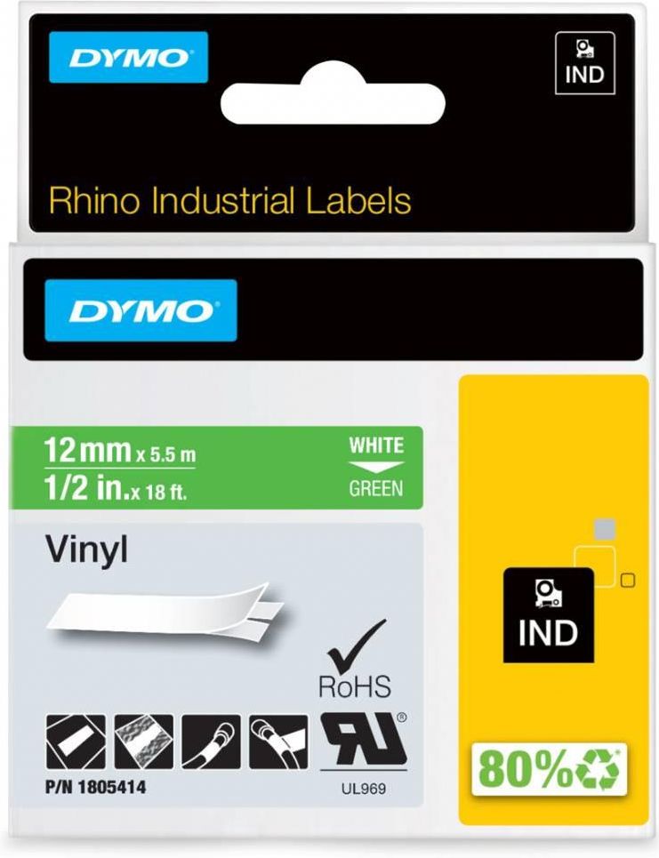 Rhino taśma winylowa 12mm biały nadruk na zielonym tle, model: 1805414. Zamiennik wysokiej jakości. Zastosowanie: Taśmy winylowe Dymo przeznaczone na krzywe powierzchnie, opis przewodów, kabli, zaokrąglonych oraz chropowatych powierzchni jak i płaskich, gładkich, równych powierzchni. Szerokość: 12 mm Długość: 5.5 m Nadruk: biały Tło: zielone Odporność na: temp. od -55°C do 135°C; promieniowanie UV, wodę, ogień, substancje chemiczne Gwarancja: Gwarancja producenta - 24 miesiące Opis: Taśma RHINO do opisów kabli i zaokrąglonych powierzchni. Taśmy winylowe Dymo przeznaczone na krzywe powierzchnie, opis przewodów, kabli, zaokrąglonych oraz chropowatych powierzchni jak i płaskich, gładkich, równych powierzchni. Odporne na wysokie i niskie temperatury, promieniowanie UV, substancje chemiczne, wilgoć. Jest idealnym rozwiązaniem, dzięki któremu wszyscy doskonale zrozumieją treść etykiet. Mocny klej i elastyczny materiał sprawiają, że ta winylowa taśma doskonale nadaje się do tworzenia etykiet na urządzenia i wyposażenie. Urządzenia kompatybilne: LabelWriter 400 Duo LabelWriter 450 Duo ILP 219 Rhino 5000 Rhino 5200 RhinoPro 6000 LabelManager LM100 LabelManager 100PLUS LabelManager LM 120 LabelManager LM 150 LabelManager 160 LabelManager LM 200 LabelManager LM 210 LabelManager 210D LabelManager LM 220 LabelManager LM 260 LabelManager 260P LabelManager LM 260D LabelManager LM 280 LabelManager LM 300 LabelManager LM 350 LabelManager 360D LabelManager 420P LabelManager 500TS LabelManager PnP LabelManager Wireless PnP ILP 219 Rhino 4200 RHINO 5200 RHINO 6000 LabelWriter LW 400 Duo LabelWriter LW 450 Duo LabelPoint LP 100 LabelPoint LP 200 LabelPoint LP 250 LabelPoint LP 350 oraz inne modele drukarek DYMO