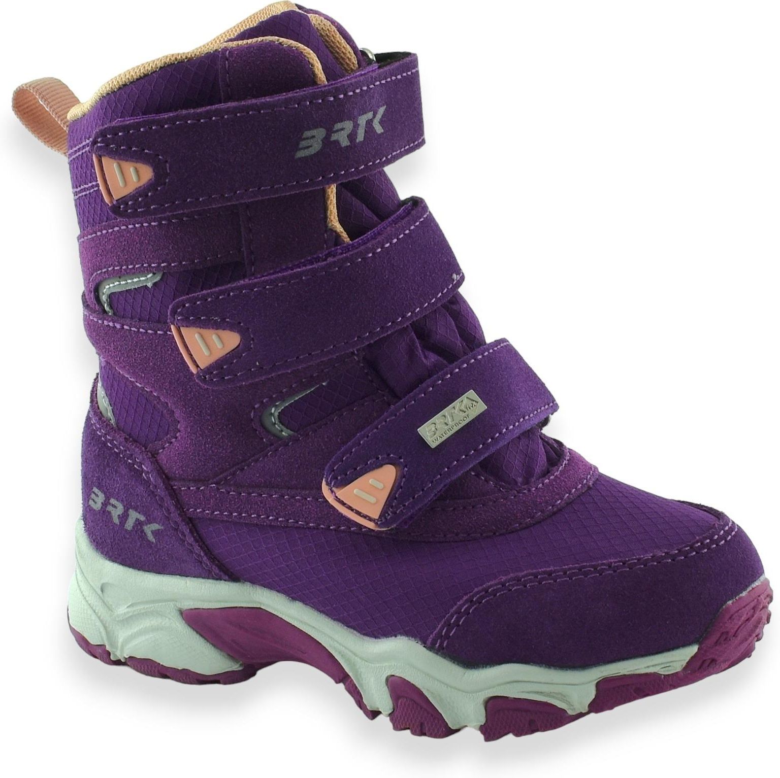 Zimowe buty dziewczęce w pięknym fioletowym kolorze. Śniegowce ocieplone wełną są wodoszczelne i wiatroszczelne dzięki membranie BRTKtex. Wysokie, zapinane na rzepy śniegowce z antypoślizgową podeszwą. Doskonałe do zabaw i spacerów w mroźne dni.