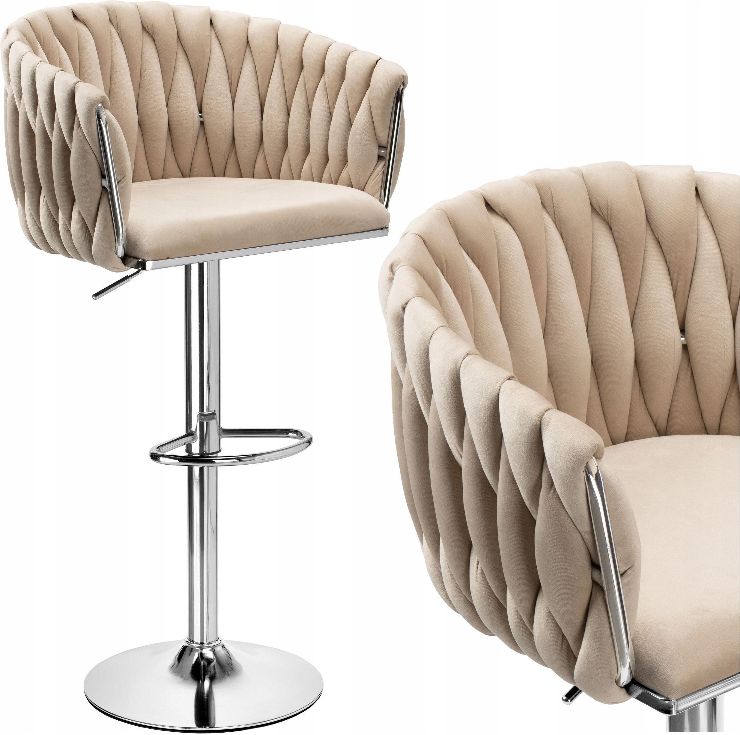 Ehokery Krzesło Hoker Barowy Welurowy Obrotowy Tapicerowany Plecione Oparcie Beżowy (069693MG) Gdynia