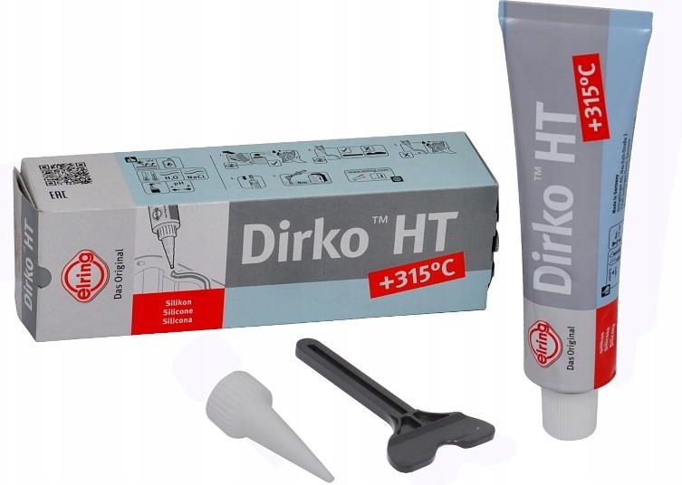 Silikon / uszczelka silikonowa DIRKO. Dirko to trwale elastyczna, odporna na temperaturę masa uszczelniająca (neutralnie utwardzalna). Uwaga!! Silikon może być stosowany we wszystkich samochodach. Opis i zastosowanie Dirko ® silikon specjalny jest elastyczną, wulkanizującą się na zimno, masą uszczelniającą w formie pasty na bazie kauczuku silikonowego, wykazującą się wyjątkową przyczepnością do metali i niemetali. Dirko ® jest stosowany do uszczelniania powierzchni, szczelin i rys na elementach konstrukcyjnych, które podlegają podczas pracy przesunięciom i odkształceniom, jak np: w silnikach, przekładniach i maszynach, pompach i łodziach, w osuszaczach, agregatach klimatyzacyjnych i chłodzących jak i zastosowaniach hobbystycznych. Dirko ® nie może być powlekany lakierem. Typowe zastosowanie AUTO: szczeliny dylatacyjne, głowica cylindrowa, skrzynia karbowa, miska olejowa, pokrywa rozrządu, termostat, pompa wodna, skrzynia biegów, osie, mechanizm różnicowy, zbiornik wyrównawczy układu chłodzenia, karoseria (miejsca nielakierowalne) MOTOCYKL: skrzynia karbowa, stopka cylindra INNE : w silnikach, maszynach i agregatach, gospodarstwo domowe Właściwości fizyczne i chemiczne Forma - pasta Kolor - szary/transparentny Zapach - aromatyczny Stan podczas pracy - elastyczny System sieciowania - Oksym Sposób użycia i zastosowanie Uszczelniane powierzchnie muszą być oczyszczone i odtłuszczone, spirytusem lub przy pomocy podobnych rozpuszczalników. Stare resztki masy silikonowej, usunąć przy pomocy zmywacza silikonu Elring-Nr. 030.800. Absolutnie czyste i odtłuszczone powierzchnie są najlepszą gwarancją skutecznego uszczelnienia (przyczepności) w stanie zwulkanizowanym. Pojemność: 70ml. Odporność na temperaturę: -60°C do +315°C Indeks - PK-00698