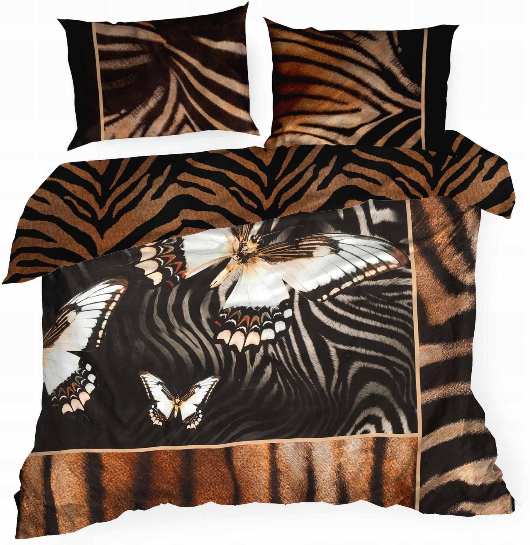 Komplet pościeli Eva zaprojektowany przez Evę Minge dla marki Eurofirany. Ta elegancka, dwustronna pościel z makosatyny przyciąga uwagę oryginalnym wzorem i połączeniem nasyconych kolorów. Jedna strona zestawu jest ozdobiona efektownym zwierzęcym printem w stylu zebry i tygrysa, w odcieniach brązu i czerni, co nadaje jej nieco "dziki" i luksusowy charakter. Druga strona wyróżnia się subtelnym motywem motyli w odcieniach bieli i czerni, co wprowadza nutę delikatności i lekkości do tego wyrazistego projektu. Zastosowanie kontrastujących barw – odcieni bieli i brązu – tworzy spójny i harmonijny wygląd, który dodaje wnętrzu elegancji i nowoczesności. Dwustronność pościeli daje możliwość dopasowania jej do różnych stylów sypialni, a jednocześnie pozwala na łatwą zmianę aranżacji bez potrzeby wymiany całego kompletu. Makosatyna to wysokiej jakości tkanina bawełniana o wyjątkowej gładkości i połysku, przypominająca satynę, ale wykonana w całości z bawełny. Produkowana jest z najwyższej klasy bawełny o długich włóknach, zwanej bawełną mako, która pochodzi z Egiptu i jest znana ze swojej miękkości oraz trwałości. Dzięki zastosowaniu tej bawełny, makosatyna jest nie tylko miękka i przyjemna w dotyku, ale także wytrzymała. W skład kompletu wchodzą poszwa na kołdrę: 220 x 200 cm - 1 szt. poszewki na poduszki: 70 x 80 cm - 2 szt. Producent: Eurofirany Rozmiar poszwy na kołdrę: 220x200 cm Kolor: brązowy, czarny, biały Skład surowcowy: 100% satyna bawełna (makosatyna) Sposób zapięcia: zamek błyskawiczny Gramatura: 125 GSM