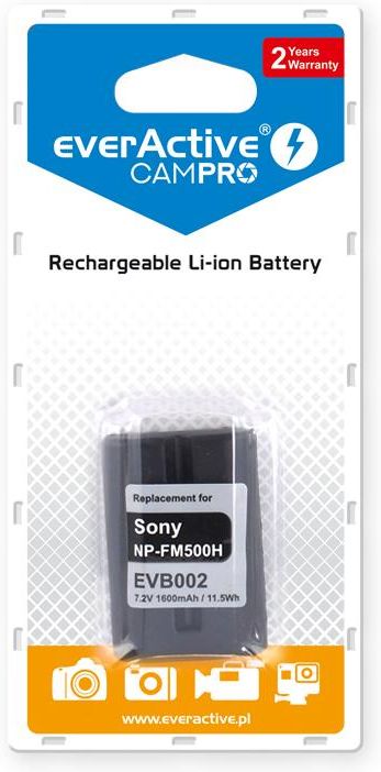 W ofercie everActive znajdziemy najbardziej popularne modele dedykowanych akumulatorków stosowanych w aparatach cyfrowych, lustrzankach i kamerach. Nasze akumulatory sand#261; doskonaand#322;and#261; alternatywand#261; dla drogich oryginalnych (fabrycznych) ogniw. Akumulatory zostaand#322;y wykonane w technologii litowo-jonowej, bez efektu pamiand#281;ci. Akumulatory sand#261; wstand#281;pnie naand#322;adowane, z minimalnym efektem samorozand#322;adowania. Oferujemy oryginalny akumulator marki everActive Li-ion 1600mAh, do sprzand#281;tu foto/video Sony. Nasz akumulator zastand#281;puje akumulatory o symbolu NP-FM500H, NPFM500H, NP FM500H Pracuje z nastand#281;pujand#261;cymi modelami (lista moand#380;e byand#263; niekompletna - w razie wand#261;tpliwoand#347;ci prosimy o kontakt): SERIA MODEL Alpha DSLR-A100, DSLR-A100H, DSLR-A100K, DSLR-A100W, DSLR-A200, DSLR-A200H, DSLR-A200K, DSLR-A200W, DSLR-A300, DSLR-A300K, DSLR-A300X, DSLR-A350, DSLR-A350H, DSLR-A350K, DSLR-A350X, DSLR-A450, DSLR-A500, DSLR-A500L, DSLR-A500Y, DSLR-A550, DSLR-A550L, DSLR-A550Y, DSLR-A560, DSLR-A560L, DSLR-A560Y, DSLR-A580, DSLR-A580L, DSLR-A580Y, DSLR-A700, DSLR-A700K, DSLR-A700P, DSLR-A700Z, DSLR-A850, DSLR-A850Q, DSLR-A900, ILCA-77M2, ILCA-77M2M, ILCA-77M2Q, SLT-A57, SLT-A57K, SLT-A57M, SLT-A57Y, SLT-A58, SLT-A58K, SLT-A58M, SLT-A58Y, SLT-A65V, SLT-A65VK, SLT-A65VL, SLT-A65VM, SLT-A65VY, SLT-A77, SLT-A77K, SLT-A77M, SLT-A77Q, SLT-A77V, SLT-A77VK, SLT-A77VL, SLT-A77VM, SLT-A77VQ, SLT-A99, SLT-A99V W 100% nowy, zapakowany w blister, akumulator zgodny z NP-FM500H, NPFM500H, NP FM500H everActive to pierwsza na polskim rynku rozpoznawalna marka wysokiej jakoand#347;ci akumulatorów dedykowanych do aparatów i kamer cyfrowych. Akumulatory dedykowane everActive oferujand#261; doskonaand#322;e parametry techniczne, wydajnoand#347;and#263; i pojemnoand#347;and#263; zgodnand#261; lub wyand#380;szand#261; w porównaniu z oryginalnymi ogniwami dostarczanymi przez producentów. Dlaczego warto wybraand#263; akumulatorki everActive: * Akumulatory objand#281;te sand#261; 2-letnim okresem gwarancyjnym, co jest rzadkoand#347;ciand#261; wand#347;ród akumulatorów i baterii dostand#281;pnych na rynku. * Kaand#380;dy akumulator zapakowany jest w jednostkowe opakowanie z tworzywa sztucznego - zawieszkand#281;/blister. Solidne opakowanie doskonale chroni akumulator podczas transportu. * Akumulatory everActive oferujand#261; realne, wysokie pojemnoand#347;ci oraz doskonaand#322;and#261; and#380;ywotnoand#347;and#263;. Pojemnoand#347;ci akumulatorów sand#261; podane oraz zweryfikowane zgodnie z obowiand#261;zujand#261;cymi przepisami i standardami obowiand#261;zujand#261;cymi w Unii Europejskiej. * Maksymalne bezpieczeand#324;stwo uand#380;ytkowania - kaand#380;dy akumulator jest dodatkowo chroniony przez elektroniczny ukand#322;ad zabezpieczajand#261;cy. Elektroniczny chip chroni ogniwo przed przed zwarciem, przeciand#261;and#380;eniem, przeand#322;adowaniem oraz nadmiernym rozand#322;adowaniem akumulatora - wszystko dla maksymalnego bezpieczeand#324;stwa uand#380;ytkowania. * Akumulatory everActive zapewniajand#261; doskonaand#322;and#261; kompatybilnoand#347;and#263; i zgodnoand#347;and#263; z oryginalnymi akumulatorami dostarczanymi fabrycznie z nowym sprzand#281;tem. * Cena oryginalnego akumulatora everActive jest wielokronie niand#380;sza od ceny porównywalnego akumulatora fabrycznego. DANE TECHNICZNE - kod producenta: EVB002 - znamionowe napiand#281;cie ogniwa - ok. 7.2V (kompatybilne z 7.4V) - caand#322;kowity brak efektu pamiand#281;ci - najnowsza technika wykonania, ogniwa o najwyand#380;szej gand#281;stoand#347;ci zgromadzonego and#322;adunku - ogniwa litowo jonowe, najwyand#380;szej jakoand#347;ci - do 1000 cykli and#322;adowania/rozand#322;adowania - wysoka pojemnoand#347;and#263; - 1600mAh - bateria zapakowana w blister - wymiary akumulatora - 56 mm x 39 mm x 20 mm - gwarancja producenta - 24 miesiand#261;ce - produkt posiada oznaczenie CE