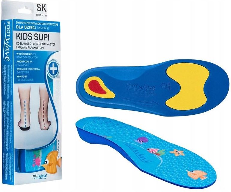 Wkładki Supinujące dla dzieci FootWave Kids Supi 28-29 28-29 Wkładki Supinujące dla dzieci FootWave Kids Supi Dynamiczne wkładki ortopedyczne FootWave KIDS SUPI to bezpieczne medyczne wkładki zaprojektowane z myślą o dzieciach, u których stwierdzono koślawość stóp i kolan lub płaskostopie. Unikatowa budowa dynamicznych wkładek FootWave pomaga zmniejszyć ból stóp dziecka, szczególnie pięty, zwiększa stabilność i komfort poruszania się. Wkładki FootWave Kids mogą być stosowane zarówno jako leczenie koślawości i płaskostopia u dzieci, jak i profilaktycznie, aby zapobiegać powyższym dolegliwościom. Pomagają w okresie intensywnego wzrostu dziecka. Dzięki korytkowej formule dobrze stabilizują tyłostopie i wymuszają poprawną postawę. Mogą być stosowane do każdego obuwia, także szkolnego i sportowego. W przypadku zaawansowanych dolegliwości stóp i szczególnych stanów chorobowych dziecka wskazana jest konsultacja z lekarzem lub specjalistą. Zaopatrując swoje dziecko we wkładki FootWave KIDS SUPI: ZAPEWNISZ WYRÓWNANIE OSI KOŃCZYN DOLNYCH Wkładki dają stopom naturalne wsparcie i stabilizację, przywracając im ich prawidłową oś ruchu - stopy i kolana "wyprostują" się. PRZECIĄŻENIA BĘDĄ AMORTYZOWANE Zmniejszy to ewentualny ból i dyskomfort, zapobiegnie mikro-urazom oraz deformowaniu się stopy. ZAPEWNISZ WSPARCIE I KONTROLĘ TYŁOSTOPIA Podwójny amortyzator kierunkowy pięty pochłania wstrząsy i rozkłada nacisk a korytko piętowe stabilizuje stopy w prawidłowych pozycjach. ZWIĘKSZYSZ KOMFORT PORUSZANIA SIĘ Miękki materiał wyściółki zapobiega obtarciom i sprawia, że wkładki są bardzo wygodne. Otwory wentylacyjne odprowadzają nadmiar ciepła i wilgoci. Jak działa i jak jest zbudowana wkładka KIDS SUPI? ELEMENT WKŁADKI FUNKCJA CO TO OZNACZA? 1 Podwójny amortyzator kierunkowy Absorbuje wstrząsy tyłostopia, kontroluje ruch 3D stawu skokowego, wprowadza prawidłowo w supinację Twoje dziecko uniknie bólu pięty a stopy będą pracować we właściwych kierunkach i zakresach ruchu 2 Płaski spód wkładki (platforma podeszwowa) Stabilizacja, wyeliminowanie niekontrolowanej rotacji Wkładki nie będą przekręcać się w obuwiu w sposób niekontrolowany podczas chodu, dzięki czemu korekcja i wsparcie będzie zawsze prawidłowe 3 Amortyzator przodostopia Amortyzacja głów kości śródstopia Miękka pelota działa jak poduszka - zwiększy się komfort poruszania się oraz zapobiegnie tworzeniu się odcisków (modzeli) w tym miejscu 4 Głębokie, wyprofilowane korytko piętowe Prawidłowe ustawienie osi kończyny dolnej w pozycji neutralnej, stabilizacja, wyeliminowanie niekontrolowanej rotacji Stopy Twojego dziecka nie będą przekręcać się w trakcie poruszania a nogi będą pracować w prawidłowych osiach (nie będą się koślawić, pięty nie będą "uciekać" na zewnątrz) 5 Podparcie łuków podeszwowych Wsparcie dla struktur anatomicznych stopy (odciążenie rozcięgna podeszwowego) Łuki podeszwowe (podłużny i poprzeczny) będą prawidłowo wysklepione, dzięki czemu stopy będą mniej się męczyć i pracować prawidłowo 6 Wyściółka z mikrofibry Bezpieczeństwo, higiena, komfort Miękki materiał zapobiega obtarciom, zapewnia wentylację i sprawia, że wkładki są bardzo wygodne. https://pielegnacjaobuwia.pl/userdata/public/gfx/19720.jpg