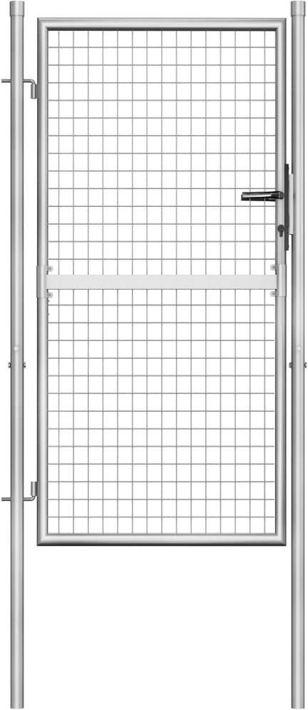 VidaXL Furtka ogrodowa, galwanizowana stal, 105x200 cm, srebrna vidaXL Kolor: Srebrny Rozmiar: 105 x 200 cm Nasza bramka prezentuje klasyczną konstrukcję, które uzupełni wygląd domu. Stworzy praktyczne wejście, pozwalające odgrodzić Twój ogród od świata zewnętrznego. Wysoce stabilna i trwała bramka będzie praktyczną barierą bezpieczeństwa dla Twojego ogrodu, patio lub tarasu. Wykonanie z grubszych, zespawanych pionowych i poziomych drutów nadaje dodatkową sztywność tej bramce ogrodowej, która zapewni duży stopień bezpieczeństwa, tworząc jednocześnie fantastyczne wejście na Twoją posesję. Wyprodukowana z mocnej stali bramka jest galwanizowana, co chroni ją przed rdzą i korozją. Ponadto dostarczana jest wraz z solidnymi zawiasami oraz mocnym zamkiem z 3 pasującymi kluczami. Montaż bramki jest łatwy. Ta bramka to doskonałe połączenie stylu, trwałości i stabilności! Kolor: srebrny Materiał: stal galwanizowana Wymiary całkowite: 105 x 200 cm (szer. x wys.) Wymiary bramki: 85 x 150 cm (szer. x wys.) Średnica słupka: 48 mm 2 słupki z wytrzymałymi zawiasami ułatwiającymi montaż Wytrzymały zamek z 3 pasującymi kluczami dołączonymi do zestawu