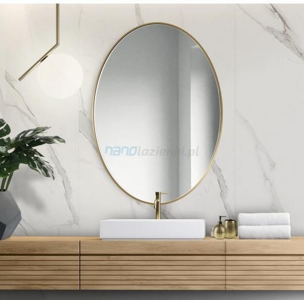 LUSTRO SCANDI SLIM OWALNE ZŁOTE 70x105cm GieraDesign SCO/SL/G/70x105 Lustro Scandi Slim owalne złote Owalne lustro łazienkowe w bardzo wąskiej złotej ramce. Idealne do wnętrza w stylu nowoczesnym, skandynawskim czy industrialnym. Piękna dekoracja salonu, sypialni czy przedpokoju, ale nadaje się również do łazienki. Lustro złote Scandi Slim owalne urzeka ponadczasową prostotą i jakością wykonania. Złota rama wykonana jest z wodoodpornej płyty MDF lakierowanej twardym dwuskładnikowym lakierem poliuretanowym metalicznym. W nią wklejone jest lustro o wysokim połysku. Z tyłu zamontowane są wieszaki. Tył lustra zabezpieczony jest dodatkowo folią wzmacniającą, która zwiększa wytrzymałość lustra oraz w razie stłuczenia utrzymuje je w ramie. Od modelu Scandi różni się cieńszą ramką – tu ma zaledwie 12 mm oraz tym, że krawędzie tafli szklanej są odsłonięte i polerowane, dzięki czemu na styku z ramą powstaje piękny błysk. Lustro jest wykonywane na zamówienie. Nasze lustra wykonujemy z najwyższej jakości belgijskich luster o dużej przejrzystości i wysokim połysku (nie używamy luster sprowadzanych z Chin o nietrwałych podlewach!). Dbamy o każdy szczegół. Szlif i polerowanie krawędzi wykonujemy na najwyższej jakości włoskich maszynach do obróbki szkła.