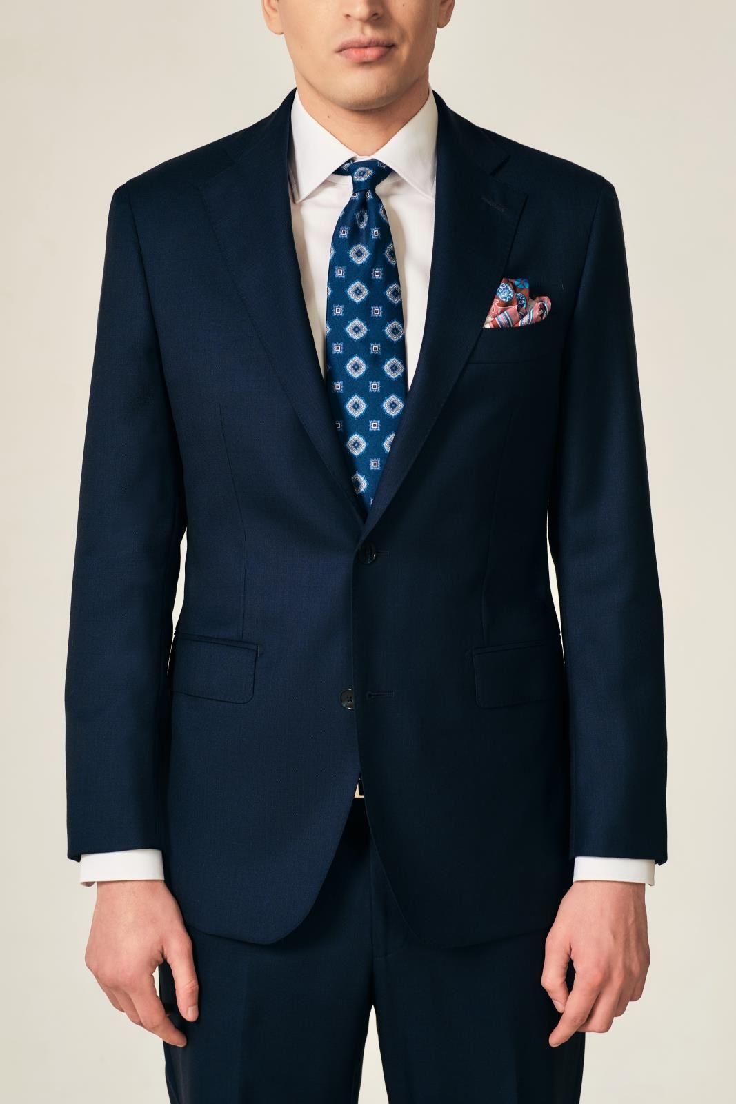 Granatowa marynarka Boston to ponadczasowa, uniwersalna elegancja w kroju slim. Marynarkę uszyliśmy z włoskiej tkaniny o gramaturze 280 g/m i składzie 100% wełna. Dzięki temu stworzyliśmy dla Was marynarkę sprawdzającą się na ważne uroczystości lub do codziennych zawodowych wyzwań, która zapewni komfort o każdej porze roku. Wysokiej jakości przędza wykorzystana do stworzenia tkaniny zachowała wszelkie oczekiwane parametry związane z zachowaniem ciepła oraz odprowadzaniem wilgoci, dzięki czemu spędzenie całego dnia w marynarce nie będzie nieprzyjemnym doświadczeniem. Mimo pozornie jednolitego koloru, tkanina marynarki Boston jest tkaniną typu sharkskin, co znaczy nie mniej nie więcej, a zastosowanie kilku tonów granatowych nici dla unikalnego koloru otrzymanej tkaniny, która delikatnie będzie zmieniać się pod wpływem rodzaju i natężenia światła. Konstrukcja marynarki Marynarka Boston oparta jest na konstrukcji half canvas. Zastosowanie płótna w obszarze klatki piersiowej nie tylko pozwala na większą oddychalność materiału, ale przede wszystkim powoduje dalsze dopasowywanie się do sylwetki wynikające z układania się tkaniny na sylwetce (dokładnie tak, jak dobrej jakości buty dopasowują się jeszcze lepiej do stopy). Klasyczne, otwarte klapy o szerokości 10cm będą w naturalny sposób podkreślać klatkę piersiową oraz ramiona noszącego, dzięki czemu optycznie krój ten będzie budował tak pożądaną sylwetkę typu V. Ponad to klapy wykończone są AMF-em który odnosi się do najlepszych tradycji krawieckich dodając całości ponadczasowego sznytu. Kieszeń piersiowa marynarki została skrojona po łuku (barchetta) zamiast po linii prostej (brustasza) dla nadania całości włoskiego sznytu, większej unikatowości oraz zdynamizowania sylwetki. Dwie proste kieszenie z patkami to według doświadczeń tysięcy uszytych w VAN THORN marynarek najpopularniejszy wybór mężczyzn, więc nie mogło tego rozwiązania zabraknąć w marynarce Boston. Jak stylizować granatową marynarkę Granatowa marynarka jest elementem, którego nie powinno zabraknąć w żadnej męskiej szafie. Razem ze spodniami Boston będzie ona tworzyła garnitur, który można włożyć na niemal wszystkie okazje. Zastąpienie granatowych spodni szarymi pozwoli uzyskać mniej formalny, lecz nienagannie klasyczny zestaw koordynowany. W wersji sportowej połączenie z jeansami lub chino oczywiście też będzie w 100% poprawne, więc jak widać do marynarki Boston pasują niemal każde spodnie i ogranicza nas jedynie fantazja noszącego. Co do tego, co pod marynarką wachlarz możliwości również jest niemal nieograniczony. W wersji biznesowej lub ślubno-weselnej gładka koszula - biała lub błękitna. W wersji biznesowej lub codziennej koszule gładkie, prążkowane kraciaste lub wzorzyste z motywami geometrycznymi lub florystycznymi. Zimą natomiast koszulę zastąpić można cienkim merynosowym golfem lub postawić na stylizację warstwową - koszula i sweter v-neck. Chcesz kupić garnitur? Sprawdź garnitur Boston Nie znalazłeś odpowiedniego kroju dla siebie? Skorzystaj z usługi szycia miarowego VAN THORN Marka VAN THORN, tworzy stylizacje w Twoim stylu i na Twoją miarę, a działa od roku 2010. Dwa salony w Warszawie i Gdyni cieszą się uznaniem zadowolonych klientów. Marka wykorzystuje innowacje w postaci dokładnego pomiaru 3D, aby uszyć idealnie każdą wybraną przez klienta stylizację. W ofercie szycie na miarę znajdziesz między innymi: garnitury, koszule, marynarki, spodnie czy zestawy ślubne. VAN THORN oferuje szycie na miarę w modelu made to measure. Ciesz się najwyższą jakością materiałów i odkryj jak mieć ubranie w swoim stylu bez sklepowych dylematów.