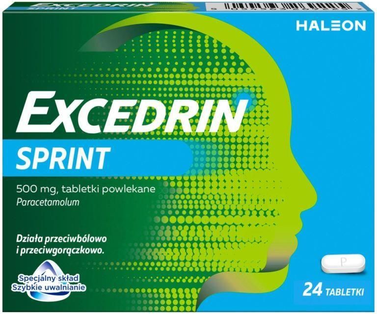 Opis Excedrin Sprint to lek dostępny bez recepty, który zawiera paracetamol – substancję o działaniu przeciwbólowym i przeciwgorączkowym. Preparat stosowany jest w różnych rodzajach bólu, takich jak ból głowy, migrena, napięciowe bóle mięśni, bóle zębów, nerwobóle, bóle kręgosłupa, kostne, stawowe i mięśniowe, a także w przypadku bolesnego miesiączkowania czy bólu gardła. Excedrin Sprint znajduje również zastosowanie w objawowym leczeniu bólu towarzyszącego łagodnym stanom zapalnym stawów, jak i w łagodzeniu dolegliwości bólowych oraz gorączki podczas przeziębienia i grypy. Lek Excedrin Sprint wyróżnia się specjalnym składem substancji pomocniczych o działaniu Optizorb™, które przyspieszają rozpad tabletki i tym samym uwalnianie substancji czynnej w organizmie. Dzięki temu tabletki zaczynają się rozpadać już w ciągu około 5 minut po podaniu, co wpływa na szybsze działanie w porównaniu do tradycyjnych tabletek paracetamolu. Preparat przeznaczony jest dla osób dorosłych i młodzieży powyżej 12. roku życia, a jego stosowanie powinno odbywać się zgodnie z zaleceniami zawartymi w ulotce lub według wskazań lekarza lub farmaceuty. Wskazania Lek Excedron Sprint stosuje się u osób dorosłych w doraźnym leczeniu: -bólu głowy, -napadów migreny (z aurą lub bez aury), -bólach zębów, -nerwobólach, -bólach kręgosłupa, bólach kostnych, stawowych i mięśniowych, -bolesnym miesiączkowaniu, -bólu gardła, -objawowym leczeniu bólu w przebiegu łagodnego zapalenia stawów. Skład 1 tabletka zawiera: substancja czynna: paracetamol 500 mg; pozostałe składniki to: skrobia żelowana, wapnia węglan, kwas alginowy, krospowidon Typ A, powidon K-25, magnezu stearynian, krzemionka koloidalna bezwodna, woda oczyszczona. Otoczka: Opadry White YS-1-7003 (o składzie: tytanu dwutlenek (E171), hypromeloza 2910, 3cp, hypromeloza 2910, 6cp, makrogol 400, polisorbat 80), wosk Carnauba, woda oczyszczona. Dawkowanie Ten lek należy zawsze przyjmować dokładnie tak, jak to opisano w ulotce dla pacjenta lub według zaleceń lekarza, farmaceuty lub pielęgniarki. W razie wątpliwości należy zwrócić się do lekarza, farmaceuty lub pielęgniarki. Wyłącznie do podania doustnego. Stosowanie u dorosłych i młodzieży w wieku powyżej 12 lat (o masie ciała powyżej 50 kg): doustnie 1-2 tabletki. W razie konieczności dawkę można powtarzać nie częściej niż co 4 godziny, do 4 razy na dobę. Maksymalna dawka dobowa paracetamolu: 4000 mg (8 tabletek). Dzieci w wieku 6-11 lat: doustnie ½ - 1 tabletki (250 mg -500 mg). W razie konieczności dawkę można powtarzać nie częściej niż co 4 godziny, do 4 razy na dobę. Maksymalna dawka dobowa paracetamolu: 60 mg/kg masy ciała/24 godziny podawane w dawkach podzielonych do 4 razy na dobę po 15 mg/kg masy ciała. Nie podawać leku dzieciom w wieku poniżej 6 lat. Bez konsultacji z lekarzem leku nie należy stosować regularnie dłużej niż przez 3 dni. Nie stosować dawki większej niż zalecana. Leku nie należy stosować częściej niż co 4 godziny. Należy zawsze stosować możliwie najniższą skuteczną dawkę leku, przez możliwie najkrótszy czas. Nie stosować jednocześnie z innymi lekami zawierającymi paracetamol. Przeciwwskazania Ten lek należy zawsze przyjmować dokładnie tak, jak to opisano w ulotce dla pacjenta lub według zaleceń lekarza, farmaceuty lub pielęgniarki. W razie wątpliwości należy zwrócić się do lekarza, farmaceuty lub pielęgniarki. Wyłącznie do podania doustnego. Stosowanie u dorosłych i młodzieży w wieku powyżej 12 lat (o masie ciała powyżej 50 kg): doustnie 1-2 tabletki. W razie konieczności dawkę można powtarzać nie częściej niż co 4 godziny, do 4 razy na dobę. Maksymalna dawka dobowa paracetamolu: 4000 mg (8 tabletek). Dzieci w wieku 6-11 lat: doustnie ½ - 1 tabletki (250 mg -500 mg). W razie konieczności dawkę można powtarzać nie częściej niż co 4 godziny, do 4 razy na dobę. Maksymalna dawka dobowa paracetamolu: 60 mg/kg masy ciała/24 godziny podawane w dawkach podzielonych do 4 razy na dobę po 15 mg/kg masy ciała. Nie podawać leku dzieciom w wieku poniżej 6 lat. Bez konsultacji z lekarzem leku nie należy stosować regularnie dłużej niż przez 3 dni. Nie stosować dawki większej niż zalecana. Leku nie należy stosować częściej niż co 4 godziny. Należy zawsze stosować możliwie najniższą skuteczną dawkę leku, przez możliwie najkrótszy czas. Nie stosować jednocześnie z innymi lekami zawierającymi paracetamol. Leku Excedrin Sprint 500 mg nie należy stosować: -jeśli pacjent ma uczulenie na paracetamol lub którykolwiek z pozostałych składników tego leku, -w razie choroby alkoholowej, -w razie ciężkiej niewydolności wątroby lub nerek. Działania niepożądane Jak każdy lek, lek ten może powodować działania niepożądane, chociaż nie u każdego one wystąpią. Należy natychmiast zaprzestać stosowania leku i zwrócić się do lekarza w razie wystąpienia: -reakcji alergicznej (uczulenia) takiej jak: wysypka skórna lub swędzenie skóry, czasem połączonych z utrudnionym oddychaniem lub opuchlizną warg, języka, gardła lub twarzy, -wysypki skórnej lub ciężkiej reakcji skórnej objawiającej się ostrą uogólnioną wysypką krostkową lub pęcherzami i nadżerkami na skórze, w jamie ustnej, oczach i narządach płciowych, gorączką i bólami stawowymi albo pękającymi olbrzymimi pęcherzami podnaskórkowymi, rozległymi nadżerkami na skórze, złuszczaniem się dużych płatów naskórka oraz gorączką, -problemów z oddychaniem, jeśli podobne problemy występowały w przeszłości podczas stosowania kwasu acetylosalicylowego lub innych niesteroidowych leków przeciwzapalnych, np. ibuprofenu, -sińców lub krwawienia o nieznanej przyczynie, -nudności, utraty apetytu, zmniejszenia masy ciała w krótkim okresie czasu, zażółcenia oczu i skóry. Powyższe reakcje wystę