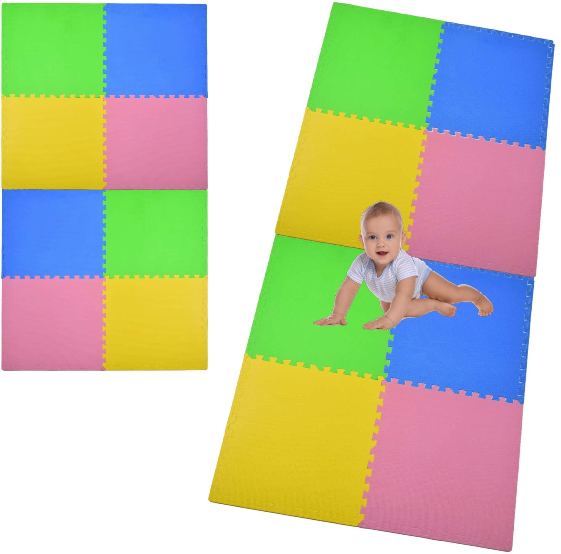 Zestaw 8 kolorowych puzzli piankowych dla dzieci o wymiarach 60 x 60 x 1 cm każdy. Puzzle w kolorach - niebieskim, zielonym, żółtym i różowym. Puzzle świetnie sprawdzą się jako mata podłogowa i miękka podkładka do zabaw z dzieckiem.