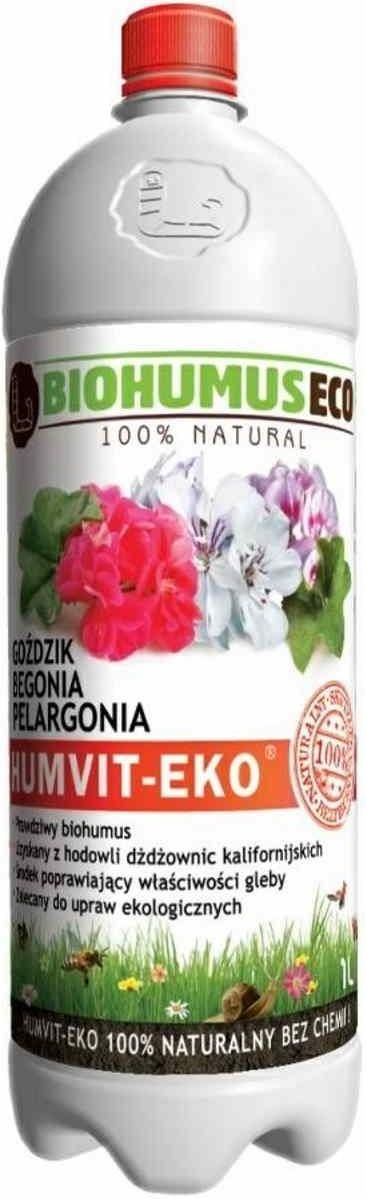 HUMVIT-EKO ROŚLINY OZDOBNE/PELARGONIA,GOŹDZIK,BEGONIA 1L To naturalny, organiczny środek poprawiający właściwości podłoży, powstały na bazie biohumusu przeznaczony do zasilania wszystkich rodzajów goździków, begonii i pelargonii w uprawach balkonowych i ogrodowych. Zapewnia intensywne i obfite kwitnienie oraz równomierne wybarwienie kwiatów. Nie ma niebezpieczeństwa przedawkowania, jest przyjazny pszczołom, organizmom wodnym i człowiekowi. To doskonały wybór dla Ciebie i Twoich roślin. Prawdziwy biohumus Uzyskany z hodowli dżdżownic kalifornijskich Środek poprawiający właściwości gleby Zalecany do upraw ekologicznych Produkt zarejestrowany w wykazie nawozów i środków poprawiających właściwości gleby zakwalikowanych do stosowania w rolnictwie ekologicznym. Decyzja nr NE 244/2014. Decyzja M.R i R.W nr. G 405/13