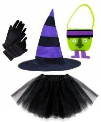 KOSTIUM CZAROWNICY 4 ELEMENTY: - KAPELUSZ CZAROWNICY WELUROWY GRUBY WYSOKIEJ JAKOŚCI Z USZTYWNIANYM RANTEM ŚREDNICA 41 CM OBWÓD- ROZMIAR UNIWERSALNY 58 CM -PASUJE NA KAŻDEGO WYSOKOŚĆ 40 CM KOLOR: FIOLETOWY /CZARNY - KOSZ NA SŁODYCZE ŁAKOĆ ALBO PSIKUS WYKONANY Z FILCU WYMIARY 32 CM (11 CM) X 18 CM X 6 CM - URZEKAJĄCA SPÓDNICZKA Z TIULU TRZYMAJĄCEGO KSZTAŁT 3 WARSTWY GRUBO NAKŁADANEGO TIULU TWORZĄCE PIĘKNĄ DUŻĄ PUSZYSTĄ BOMBKĘ GUMKA OBSZYWANA SATYNOWĄ LAMÓWKĄ WYMIARY ORIENTACYJNE : OBWÓD PASA 40CM , ROZCIĄGA SIĘ DO-80 CM DŁUGOŚĆ 30 CM ROZMIAR UNIWERSALNY- NA GUMCE - RĘKAWICZKI KOSTIUMOWE CZARNE ,ELASTYCZNE ROZMIAR UNIWERSALNY DŁ 24 CM