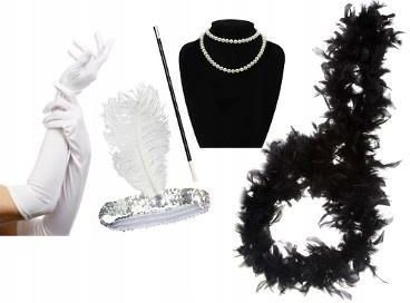 zestaw damski LATA 20STE 5 ELEMENTÓW RĘKAWICZKI, OPASKA, CYGARETKA, PERŁY, BOA RĘKAWICZKI KOSTIUMOWE DŁ OK 42 CM ROZMIAR INIWERSALNY , ROZCIĄGLIWE-PASUJĄ NA KAŻDĄ DŁOŃ OPASKA z cekinowej gumy ozdobiona strusim piórem. Opaska szerokość 2,5cm, długość pióra ok. 20cm. Rozmiar uniwersalny. NASZYJNIK Z PEREŁ CYGARETKA, długość ok.31cm, ma biały ustnik oraz chromowaną końcówkę. SZAL BOA Z PIÓR CZARNE PIÓRA DŁUGOŚĆ OK. 180 CM SZER OK. 8 CM
