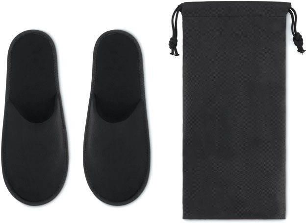 Para poliestrowych kapci hotelowych w etui z włókniny. Rozmiar EUR 44–45.