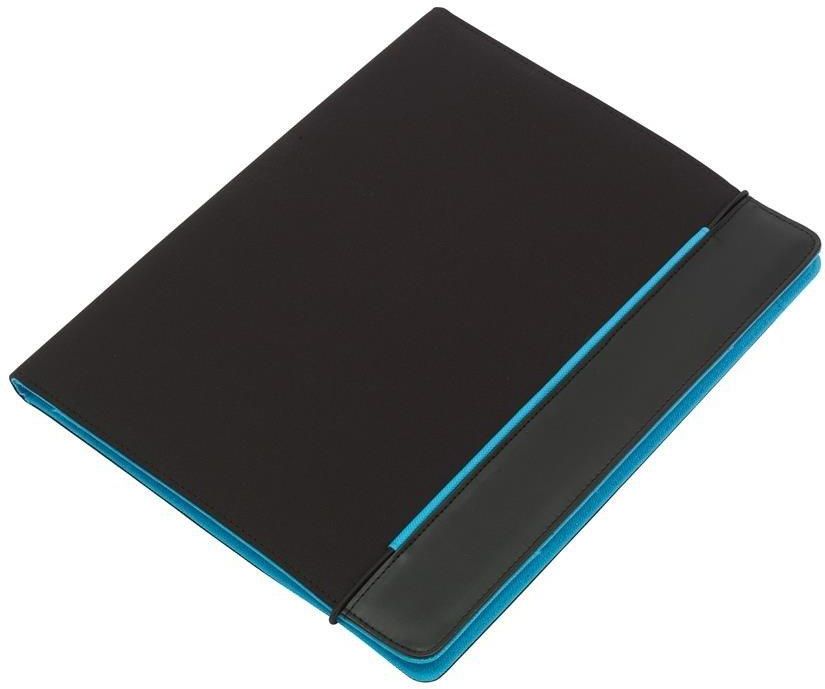 Portfolio YOUNG STAR w formacie A4 Z notesem, wsuwanymi kieszonkami, pętelkami na długopis i inne akcesoria, zamykane gumką. Na zewnątrz czarne, w środku kolorowe.