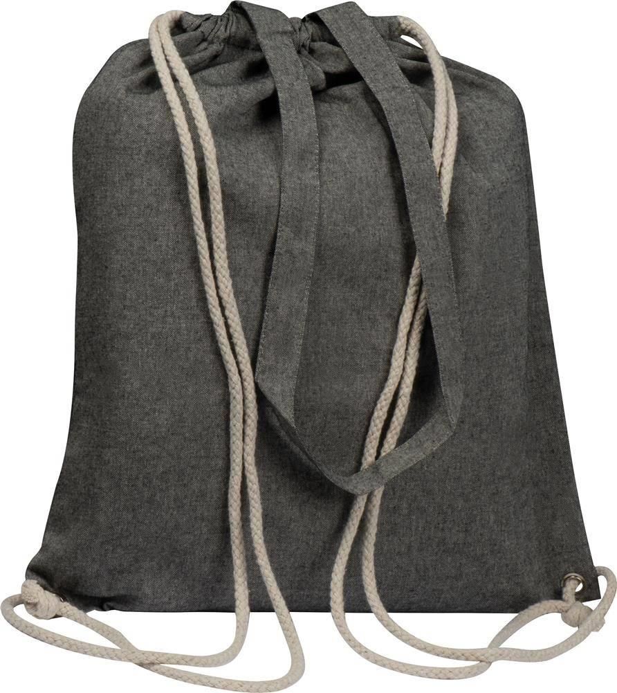 Bawełniana torba-worek z bawełny pochodzącej z recyklingu, z certyfikatem Oeko-Tex® STANDARD 100, o gramaturze 140g/m². Torba posiada długie uchwyty do noszenia na ramieniu i sznurki do zamykania i noszenia na plecach.