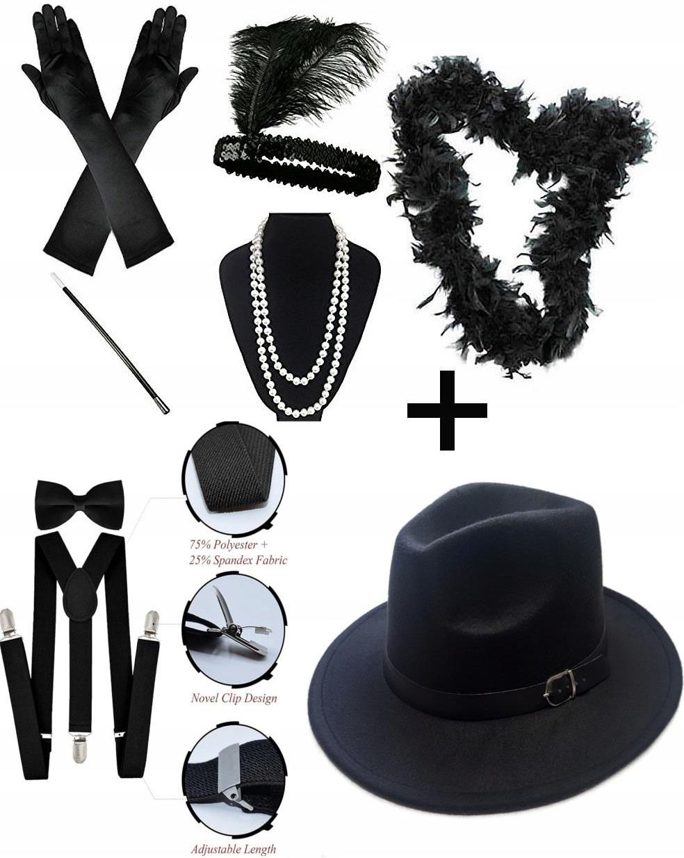 komplet na impreze dla kobiety i mężczyzny w skłąd wchodzą: dla kobiety: opaska z piórkiem - charlestone szal boa rękawiczki naszyjnik cygaretka dla mężczyzny: kapelusz gruby z dużym rondem obwód 57-58 szelki z klipsame metalowym muszka