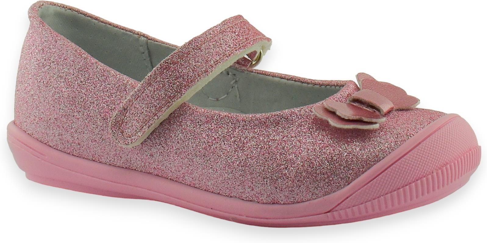 Śliczne, błyszczące balerinki dla małych dam z ozdobną kokardą na przodzie. Zapięcie na rzep oraz skórzana wkładka zapewnią wygodę i komfort małym stópkom. Idealne na wiosenne spacery a także różne uroczystości przedszkolne.