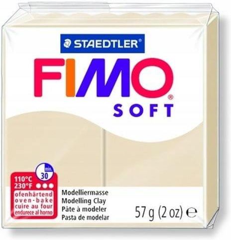 Kostka Fimo soft 57g Sahara (piaskowa) masa termoutwardzalna Staedtler Miękka masa plastyczna do wytwarzania precyzyjnych przedmiotów. Idealna do tworzenia biżuterii, figurek, dekoracji na szkle. Utwardzana w piekarniku w temp. 110 st. C przez 20 -30 min. Po wypaleniu utrzymuje kształt i kolor. Kolory można ze sobą mieszać (soft, effect, classic) Kostka 57 g (wymiar kostki 55 x 55 x 15 mm).