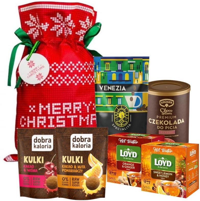 Zestaw Prezentowy Na Święta zawiera: Kawa ziarnista Świeżo palona Venezia Specialita Grande Riserva 250g. Herbata Loyd Hot Winter o smaku cytryny z miodem 15 torebek, Herbata Loyd Hot Winter o smaku pomarańczy z imbirem 15 torebek, Czekolada do picia w puszce KRUGER, Kulki Kakao & Nuta Pomarańczy Kulki Kakao & Wiśnia Do każdego zestawu dodajemy duży worek prezentowy, który idealnie nadaje się do zapakowania prezentów, dzięki temu nie musisz martwić się o świąteczne opakowanie. Otrzymasz gotowy, spakowany prezent, dzięki któremu sprawisz radość każdej osobie. Zestaw zawiera 1. Kawa ziarnista Świeżo palona Venezia Specialita Grande Riserva 250g Grande Riserva, to certyfikowana kawa jakości Speciality, skomponowana z najlepszych ziaren Arabiki. Zaskoczy Cię swoimi dwoma odmiennymi obliczami. Na pierwszym planie kształtuje się subtelna słodycz, którą balansuje przyjemna wiśniowa kwasowość. Grande Riserva najlepiej sprawdzi się w Espresso, ale jest to również ciekawa pozycja dla wielbicieli delikatnych kaw mlecznych. Aromat: 4,5 / 5 Body: 3 / 5 Intensywność: 2 / 5 Słodycz: 3 / 5 Crema: 3,5 / 5 Kwasowość: 2 / 5 Pochodzenie ziaren: Brazylia Idealne do: Espresso, Lungo, Cappuccino 2. Herbata Loyd Hot Winter o smaku cytryny z miodem 15 torebek Smak inspirowany tradycyjnym napojem marynarzy brytyjskiej marynarki wojennej Grog. Nazwa pochodzi od twórcy napoju – wiceadmirała Starego Grogmana, który nakazał rozcieńczyć cały rum na statku wodą i sokiem z cytryny. Później napój został wzbogacony o przyprawy, które ujawniły jego smak. Spicy Grog to idealny napój na zimę, który sprawi, że każdy zimny wieczór stanie się ciepły i przyjemny! 3. Herbata Loyd Hot Winter o smaku pomarańczy z imbirem 15 torebek Smak inspirowany jest tradycyjnym szwedzkim świątecznym napojem – Glögg. Napój pojawił się w Szwecji w późnym średniowieczu, kiedy do wina niskiej jakości dodano cynamon, kardamon, goździki i skórki pomarańczowe. Później wino doprawione miodem i przyprawami było podgrzewane i używane jako napój rozgrzewający w zimnych porach roku. Dziś szwedzki Glögg to połączenie czerwonego wina, porto i brandy przesiąknięte aromatycznymi przyprawami. 4. Czekolada do picia 43% puszka KRUGER 220g Czekolada z 43% zawartością kakao – wytrawna i zarazem delikatna. Wystarczy połączyć ją z mlekiem, by poczuć cudownie kremową konsystencję i przeżyć wyjątkowe chwile. Czekolada o obniżonej zawartości tłuszczu. Czekolada idealnie słodka - uwielbiana zarówno przez dzieci i dorosłych! Przyjemny, aksamitny smak! 5. Kulki Kakao & Nuta Pomarańczy Słodkie kulki bez dodanych cukrów o świątecznym smaku kakao i pomarańczy. Idealne jako dodatek do kawy, czy zdrowa przekąska w ciągu dnia. Bardzo prosty skład oparty tylko na naturalnych produktach sprawia, że jest to świetna alternatywa dla słodyczy na bazie cukrów prostych. Intensywny smak kakao i pomarańczy świetnie sprawdzi się w parze z filiżanką dobrej kawy. 6. Kulki Kakao & Wiśnia Słodkie kulki o niezwykle głębokim smaku prawdziwego kakao i wiśni. Idealne jako dodatek do kawy, czy zdrowa przekąska w ciągu dnia. Bardzo prosty skład oparty tylko na naturalnych produktach sprawia, że jest to świetna alternatywa dla słodyczy na bazie cukrów prostych. Aromat wiśni idealnie będzie idealnie współgrał z nutami wyczuwalnymi w kawie Venezia Grande Riserva. Idealne na prezent, ładnie zapakowane - dla fanów najwyższej jakości kawy i herbaty! Zestaw nie zawiera próbek, są to pełnowartościowe produkty w oryginalnych opakowaniach i o oryginalnej gramaturze.