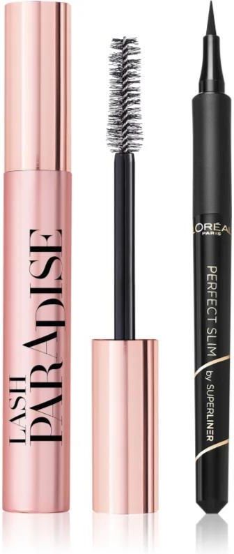 L’Oréal Paris Lash Paradise, 2 szt., Eyelinery dla kobiet, Zawartość zestawu: L’Oréal Paris Lash Paradise tusz wydłużający rzęsy do zwiększenia objętości 6.4 ml L’Oréal Paris Superliner Perfect Slim eyeliner w pisaku 1 g Sposób użycia: Narysuj delikatnym pociągnięciem kreskę na powiece. Pozostaw do wyschnięcia. Nanoś tusz delikatnymi pociągnięciami na rzęsy od nasady aż do końcówek. Dla lepszego efektu nałóż więcej warstw.
