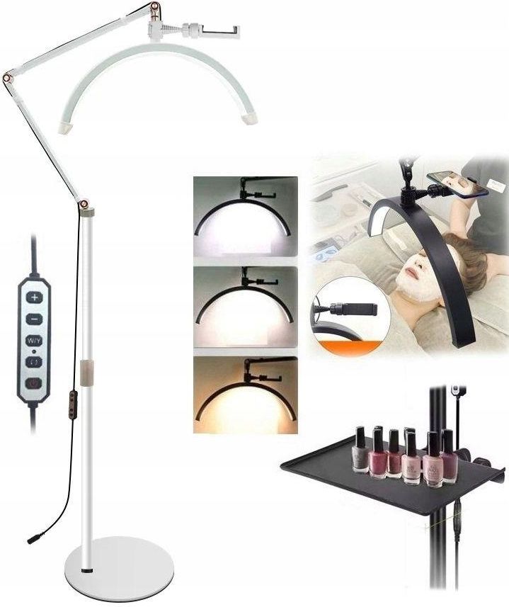 Lampa diodowa LED 24W typu Moon / Półksiężyc Lampa Kosmetyczna / Zabiegowa Lampa Podłogowa + Wysoki statyw + Stabilna - okrągła podstawa + Uchwyt na telefon + Półka na akcesoria / kosmetyki Regulacja barwy światła (temperatury barwowej) / 3 poziomy Płynna regulacja mocy oświetlenia (wbudowany …