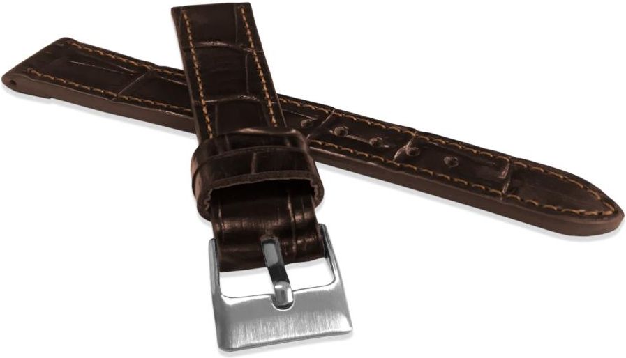 LAVVU Brązowy szyty pasek CROCO z luksusowej skóry Top Grain - 16 Stan: Nowy Pasek:: skórzany Kolor:: srebrny, brązowy Klamra:: ze stali nierdzewnej Marka:: LAVVU Szerokość paska (mm):: 16 Rodzaj skóry:: gładka skóra wołowa Top Grain Długość dolnej części (mm): 120 Długość górnej części (mm): 85 Hiszpańska skóra "Top Grain", z której wykonany jest ten pasek, jest często określana jako najlepsza skóra na świecie. Podczas gdy powszechnie dostępne paski skórzane zawierają jedynie sprasowane dolne warstwy skóry (tzw. "Genuine Leather"), w przypadku skóry "Top Grain" wybierane są jedynie najdelikatniejsze i najbardziej wytrzymałe części górnej skóry. Są one następnie cięte na precyzyjne kawałki, barwione organicznie przy użyciu naturalnych barwników i zszywane bawełnianą nicią, aby nadać im sportowy charakter. W słonecznej Hiszpanii, dzięki tej precyzyjnej pracy ręcznej powstają wyjątkowe, trwałe i giętkie paski z najlepszych na świecie materiałów, gotowe nadać Twojemu zegarkowi niepowtarzalny i luksusowy wygląd.